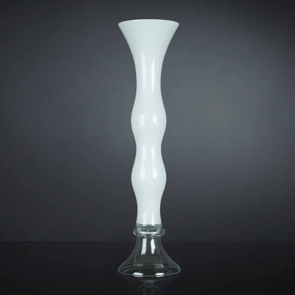 Decorative vase made of white glass with a transparent base through a 100% Made in Italy processing . A refined complement whose structure develops in height proposing a slender figure with soft shapes perfect for furnishing and completing environments with a sophisticated and classy aesthetic thanks also to the timeless elegance of glass, a quality and high value material . An ideal design for the most varied environments, from home furnishings to that of hotels, restaurants, contract areas, spas but also as a setting for events and weddings.