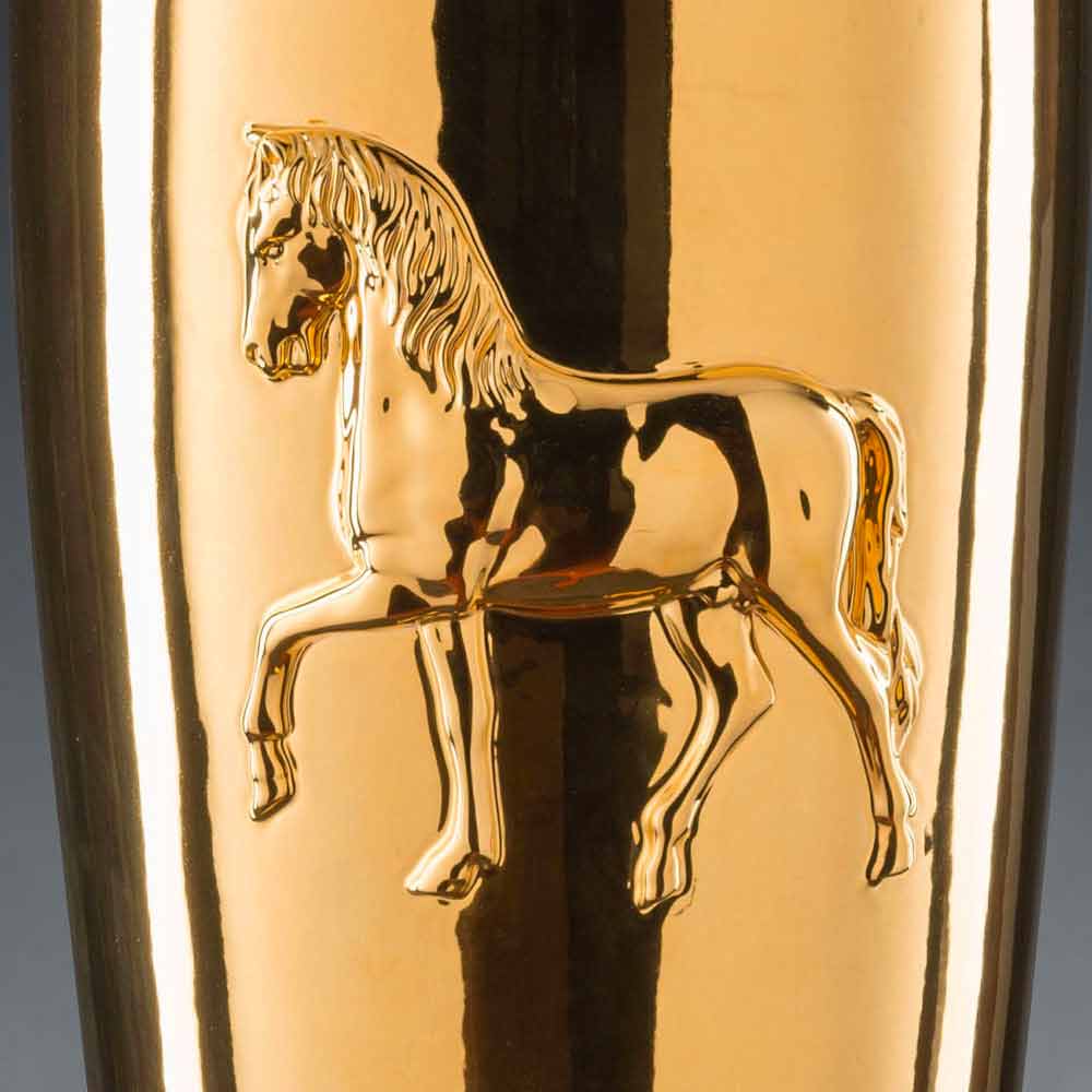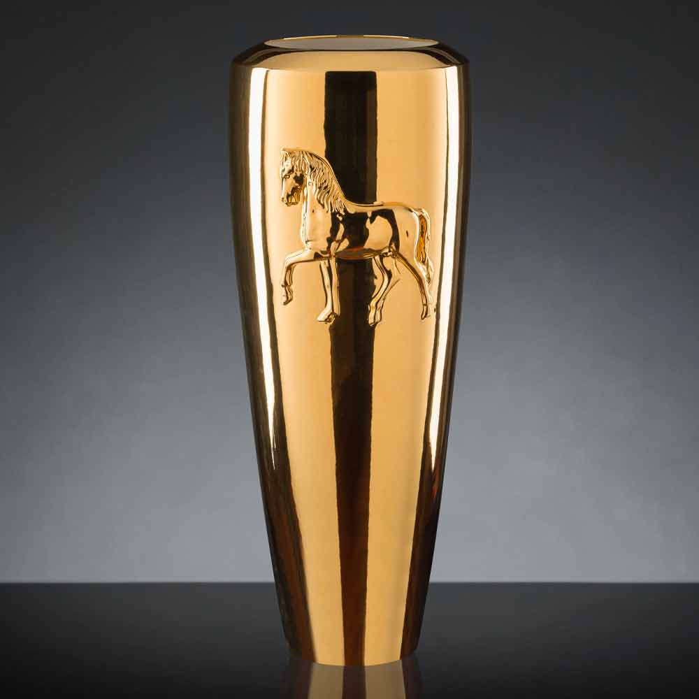 Tall ornamental vase made of ceramic with a glossy 24k gold finish handmade in Italy by craftsmen who have been experts in the sector for generations. A one-of-a-kind piece of furniture whose structure is marked by simple shapes enriched by the frontal decoration that emphasizes its uniqueness. The particular color chosen also makes it extremely elegant, capable of completing the surrounding furnishings with personality. The use of ceramics and craftsmanship increase its value and value to give life to an exclusive and high-quality result . An ideal design for the most varied environments, from home furnishings to that of hotels, restaurants, contract areas, spas but also as a setting for events and weddings.