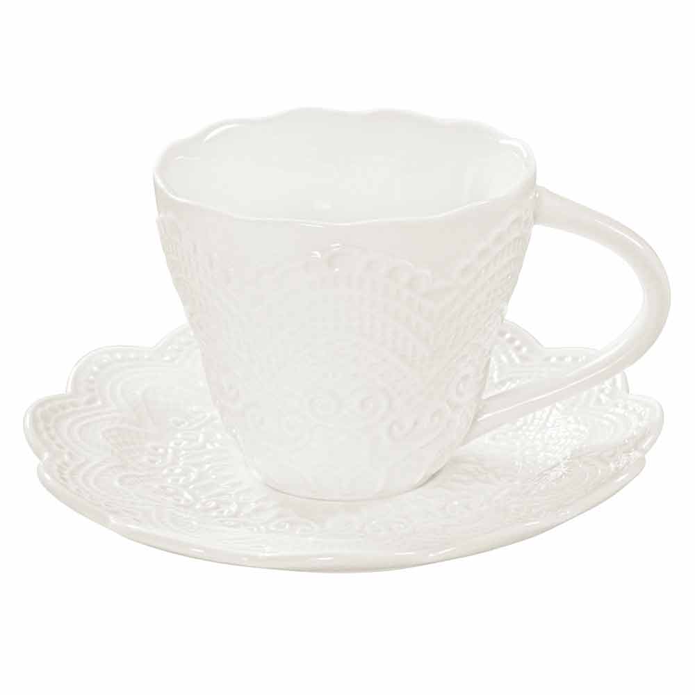 The high quality porcelaincup was created to decorate the table with refined beauty and romance. With its expression inspired by a Baroque style design , full of romance and sweet memories, it is perfect for setting up the table in a chabby chic or total white style , thanks to its retro shapes enriched with relief motifs with lace and lace.