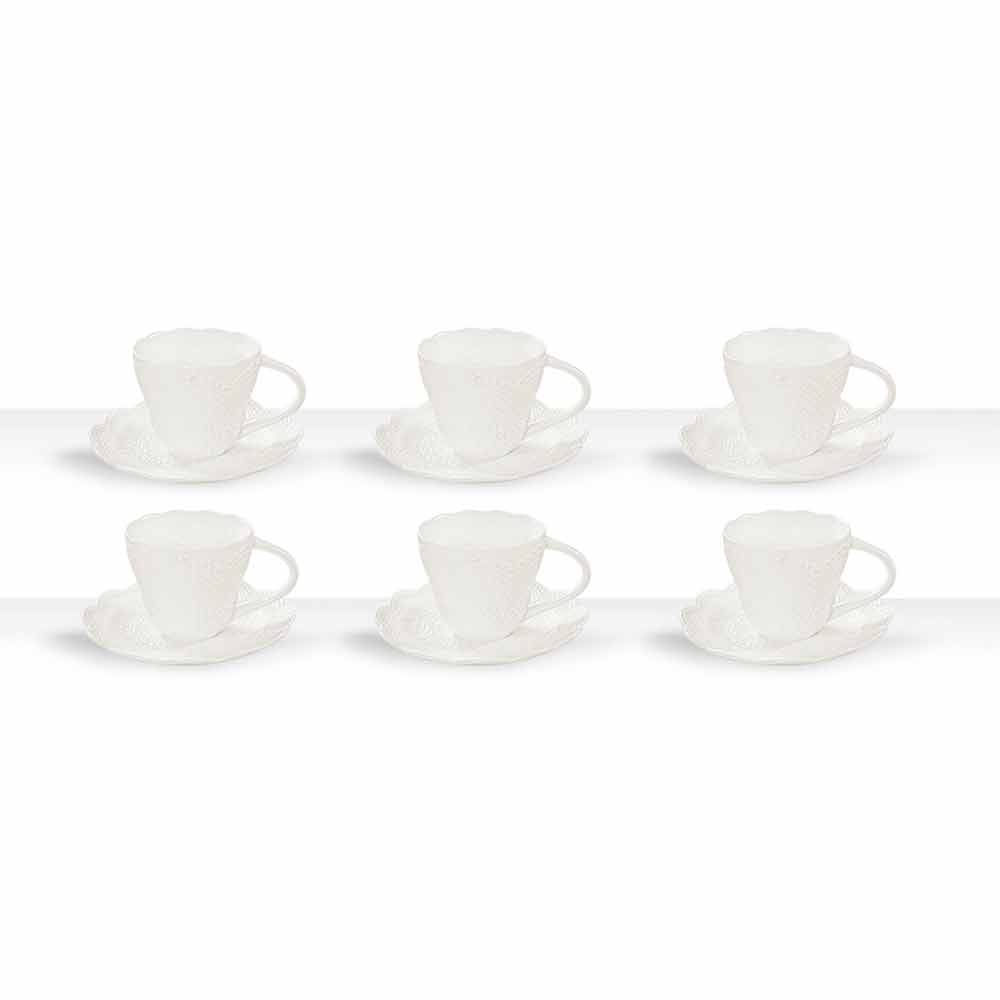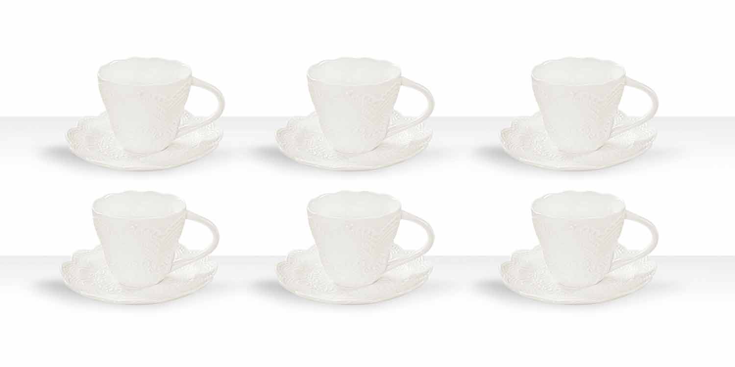 6 Tea cups with saucer in white porcelain of refined Baroque style design.