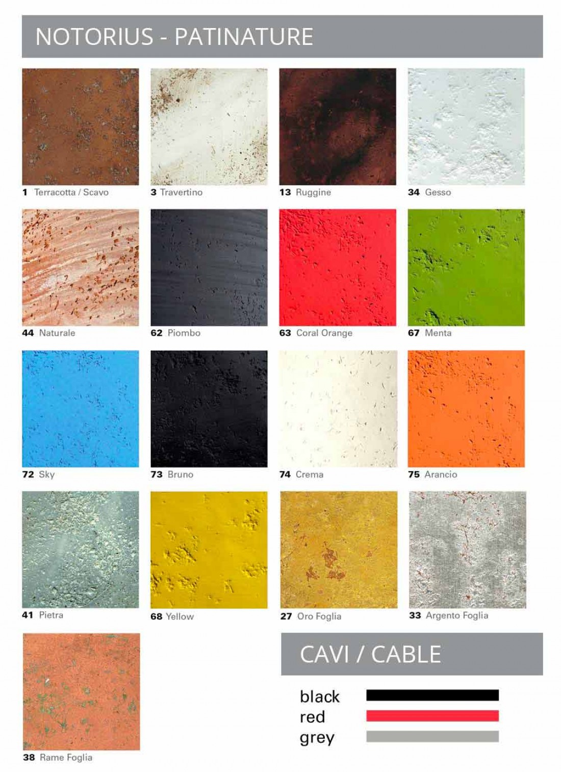 Please note: Lamp available in different chromatic variations, both for the external finish, both for the internal one, and for the shade of the electric cable. View the color chart and indicate the desired color codes in the appropriate box.