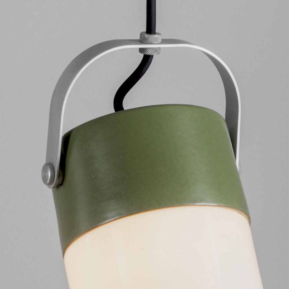 Toscot Swing suspension lamp in blown glass made in Tuscany Toscot designs a "rocking" lamp with a simple and cylindrical geometric line. It is called Swing after the famous dance, in English to swing, and it is a lantern mounted on a system on a steel cable with a handle that allows this undulatory movement. The materials used are aluminum, terracotta with cold decorations and enamels that close the diffuser glass. It is also available as a wall lamp and can also be used for outdoor projects.