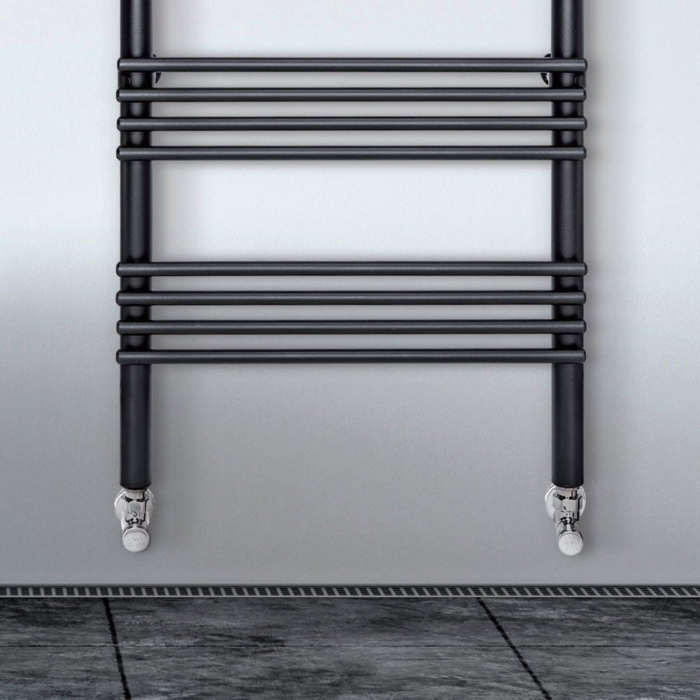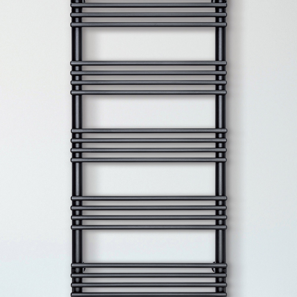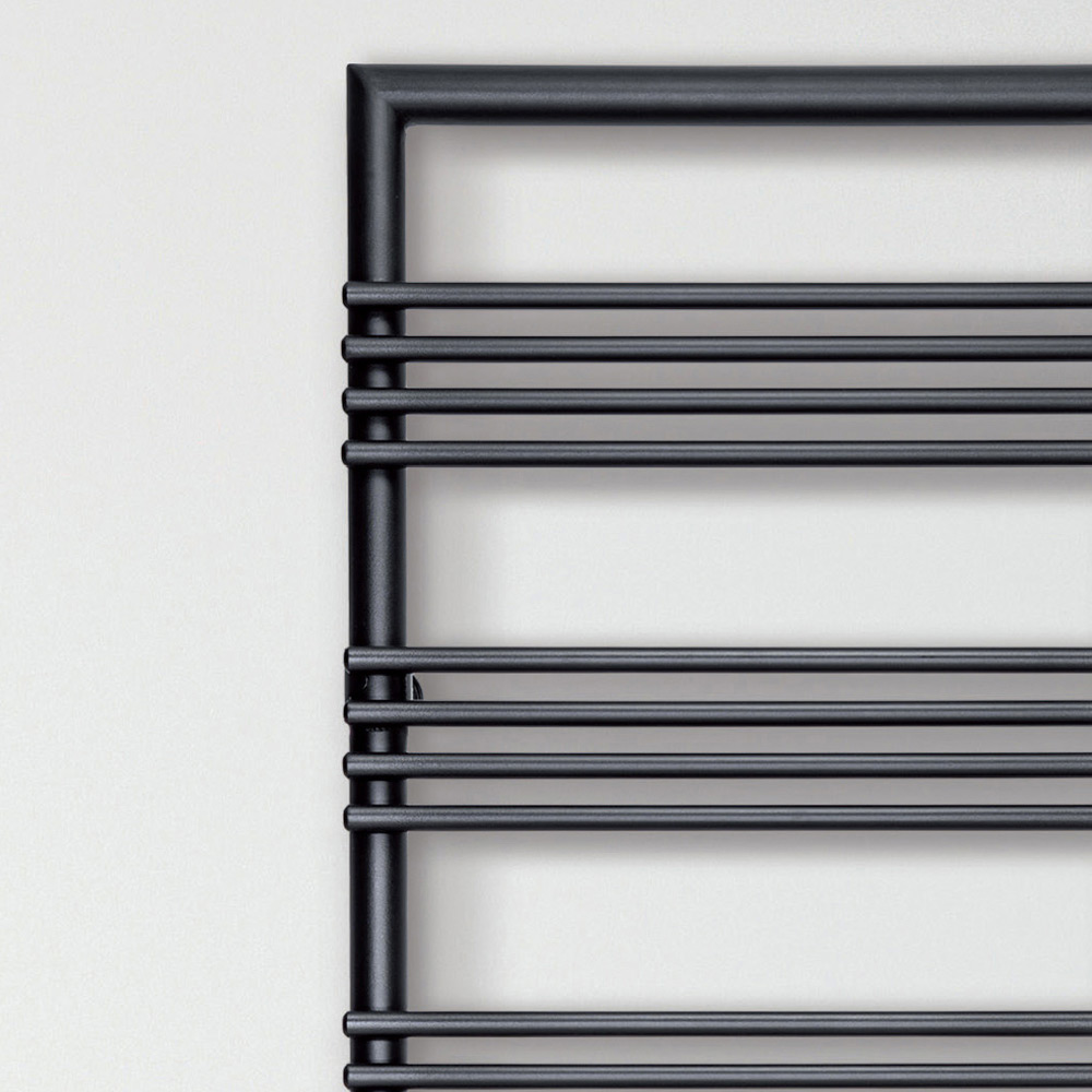 Hybrid heated towel rail in carbon steel with NEGS finish consisting of a series of horizontal elements with a diameter of 1.6 cm welded onto vertical manifolds with a diameter of 3.5 cm. Entirely made in Italy with wall fixing kit, vent valve and blind plug included .