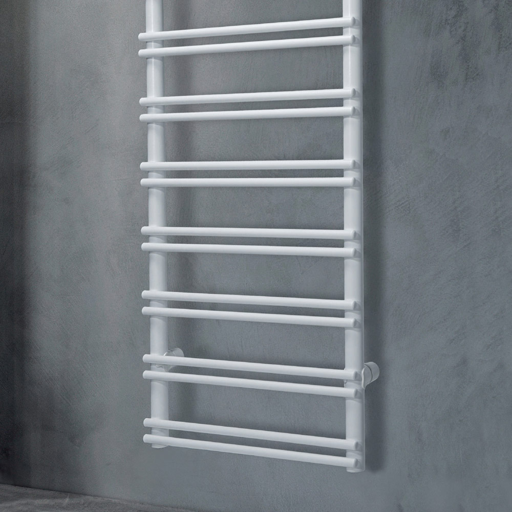 Electric towel warmer in carbon steel with traffic white finish with horizontal elements and vertical collectors entirely made in Italy with wall fixing kit included . Electrification kit positioned at the bottom right.