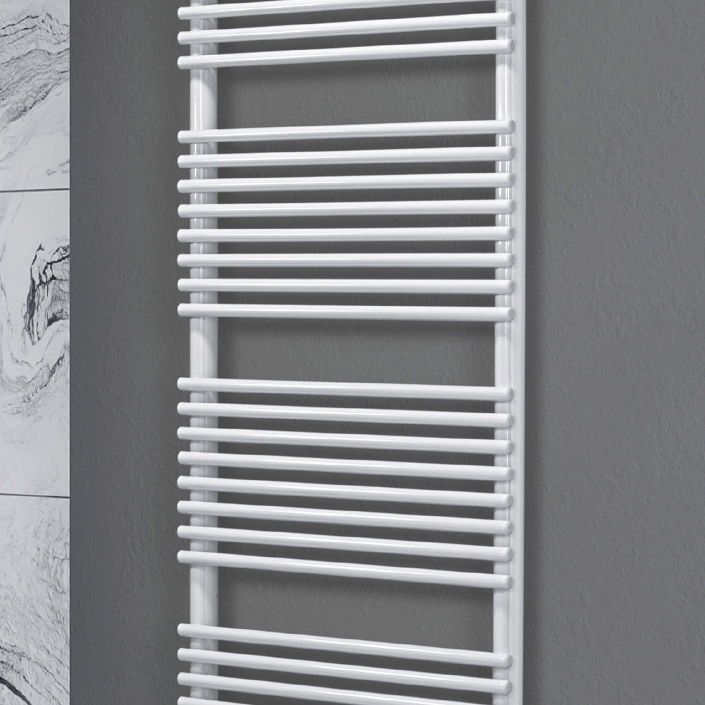 Mixed towel warmer in carbon steel with pure glossy white finish consisting of a series of horizontal elements with a diameter of 1.6 cm welded onto vertical manifolds with a diameter of 3.5 cm entirely made in Italy with wall fixing kit, vent valve and blind plug included .