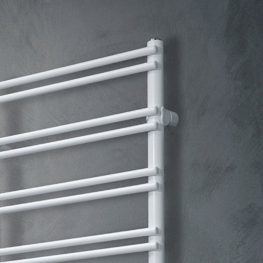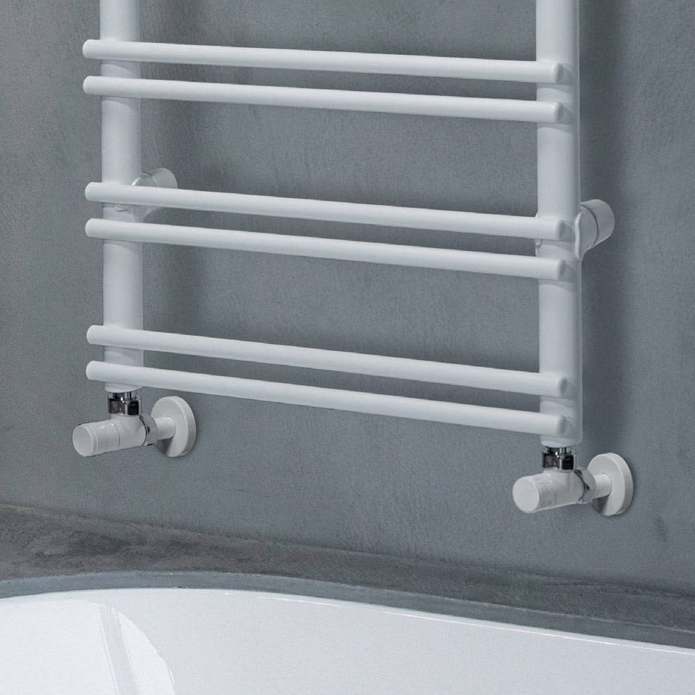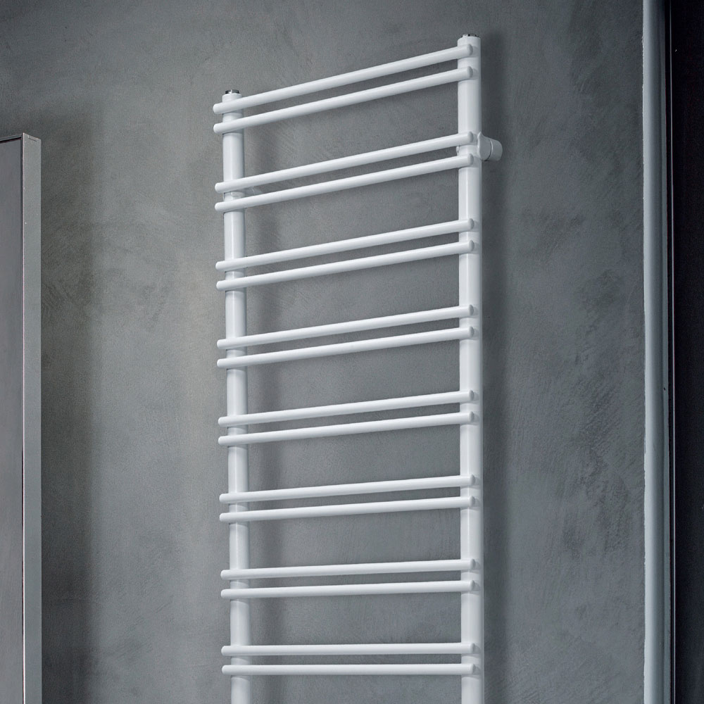 Mixed towel warmer in carbon steel with traffic white finish consisting of a series of horizontal elements with a diameter of 1.6 cm welded onto vertical manifolds with a diameter of 3.5 cm. Entirely made in Italy with wall fixing kit, vent valve and blind plug included .