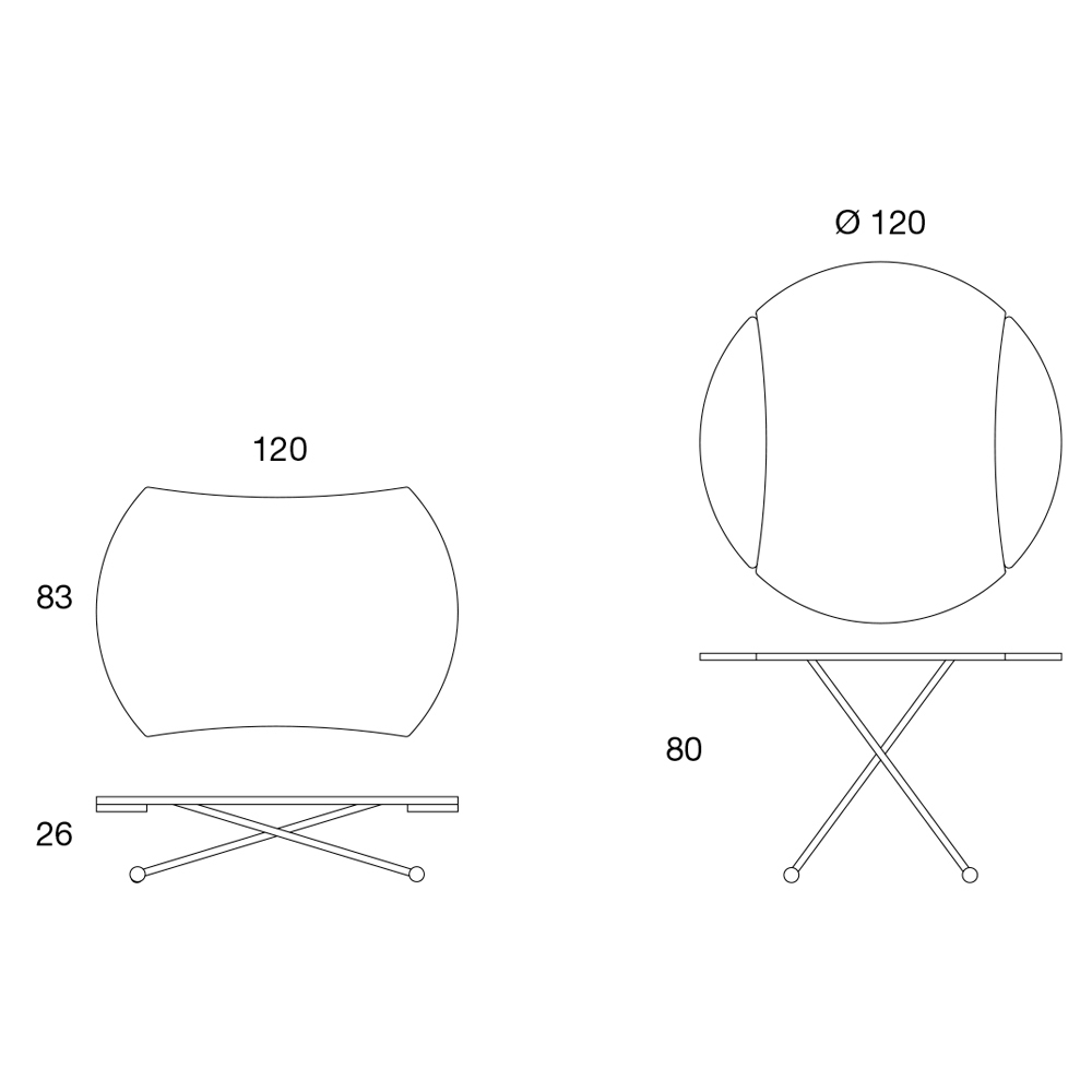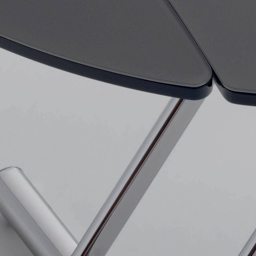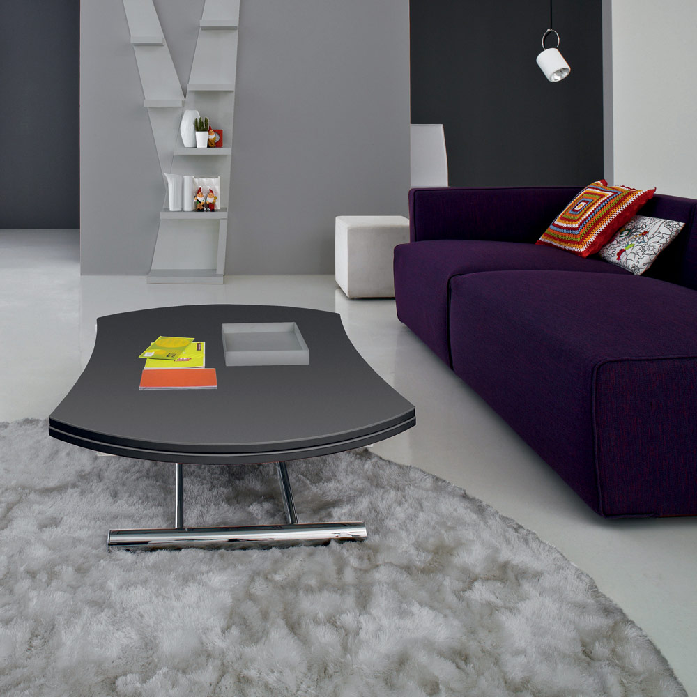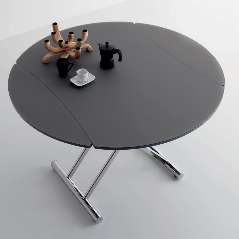 This coffee table converts into a dining table through a gas mechanism it has a polished chromed metalbase with retractable wheels and an irregular top that can be transformed into a round one made of etched glasson panel.
