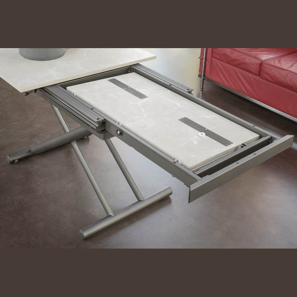 But the real magic happens when it transforms. With a simple action, this versatile piece rises and expands, transforming into a spacious and welcoming dining table. The mechanism is fluid and intuitive, designed to offer maximum functionality without sacrificing style.