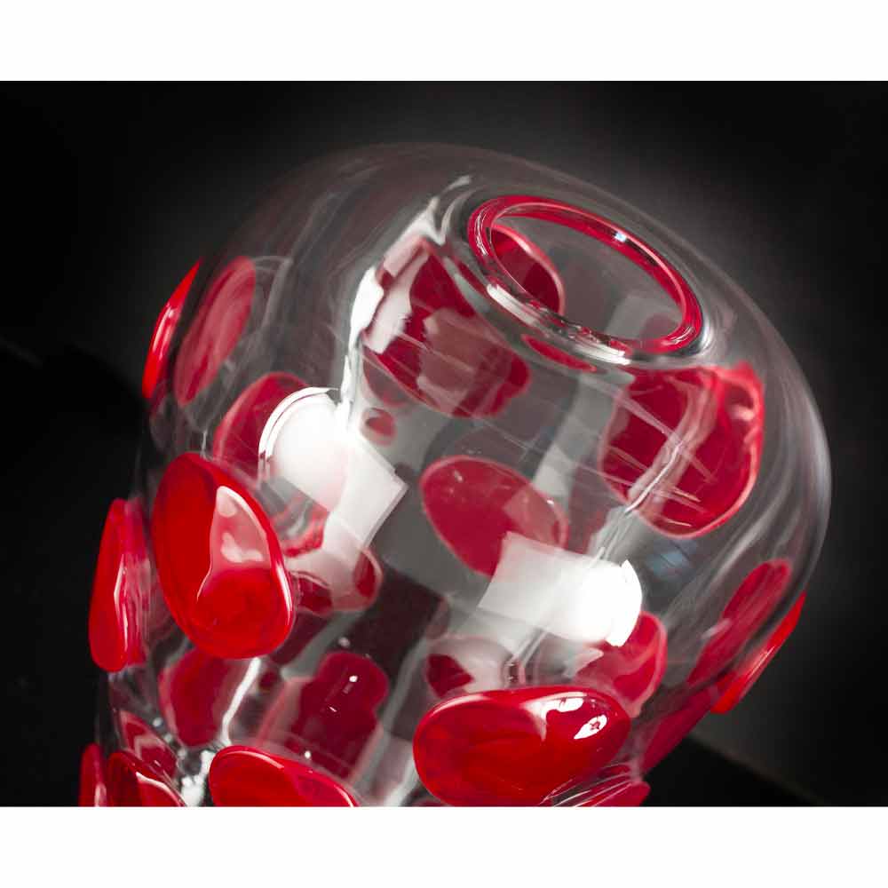 Elegant vase for interiors in transparent Murano blown glass with round details in bright red made through a process entirely Made in Italy . A complement that combines the extreme elegance of Murano glass and its wonderful features with a modern and lively design to give life to an idea of exclusive and avant-garde furniture capable of enriching any domestic space and not with a touch of color . An ideal style for the most varied environments, from home furnishings to that of hotels, restaurants, contract areas, spas but also as a setting for events and weddings.