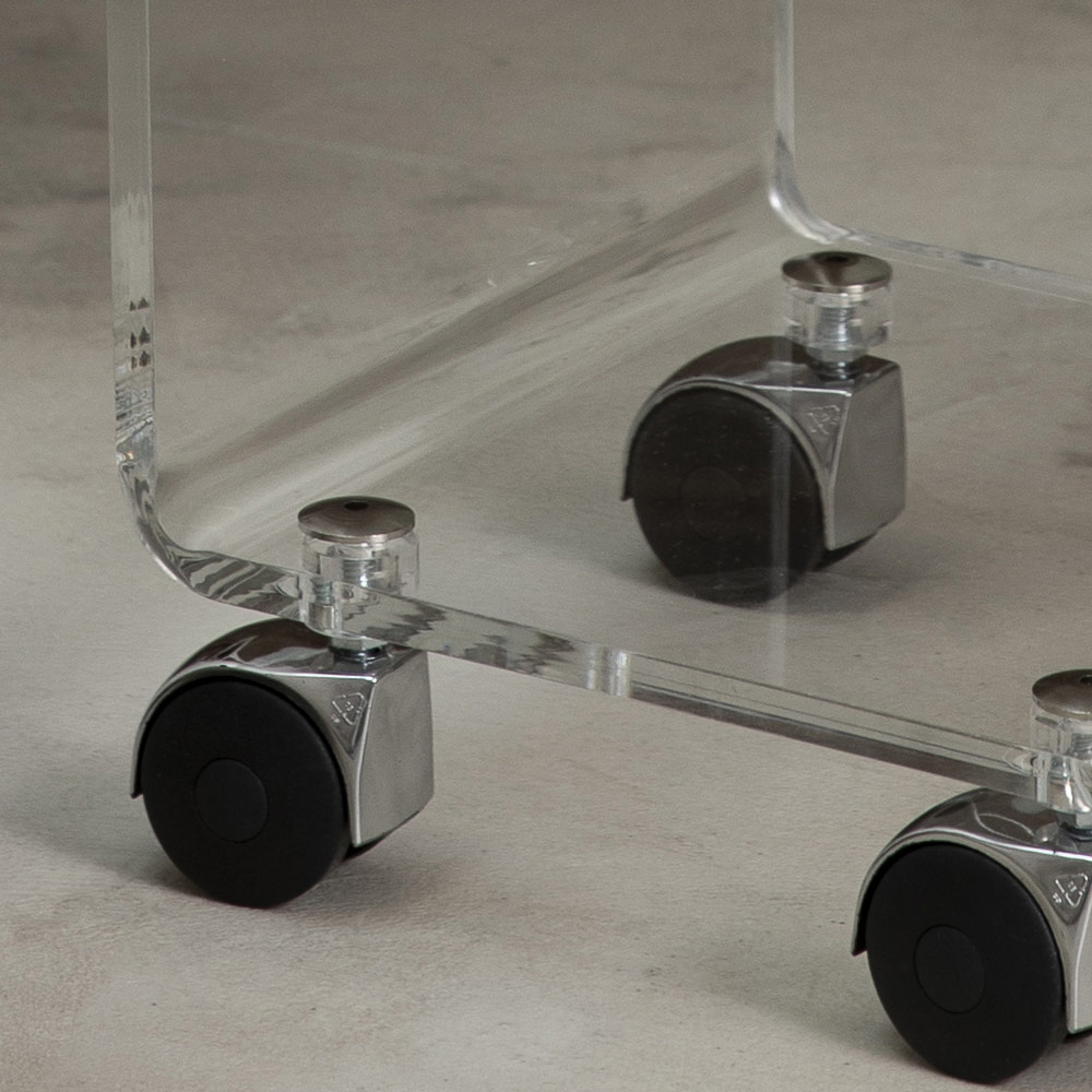 This trolley for the living room with a freestanding column design is entirely made of transparent acrylic glass with a thickness of 8 mm with 1 or 3 shelves and swiveling wheels. Besides being a complemento elegant and functional furniture it is also an object of extremely versatile and space-saving design. The acrylic crystal is the methacrylate polymer that is characterized by the purity of its transparency that surpasses natural crystal.