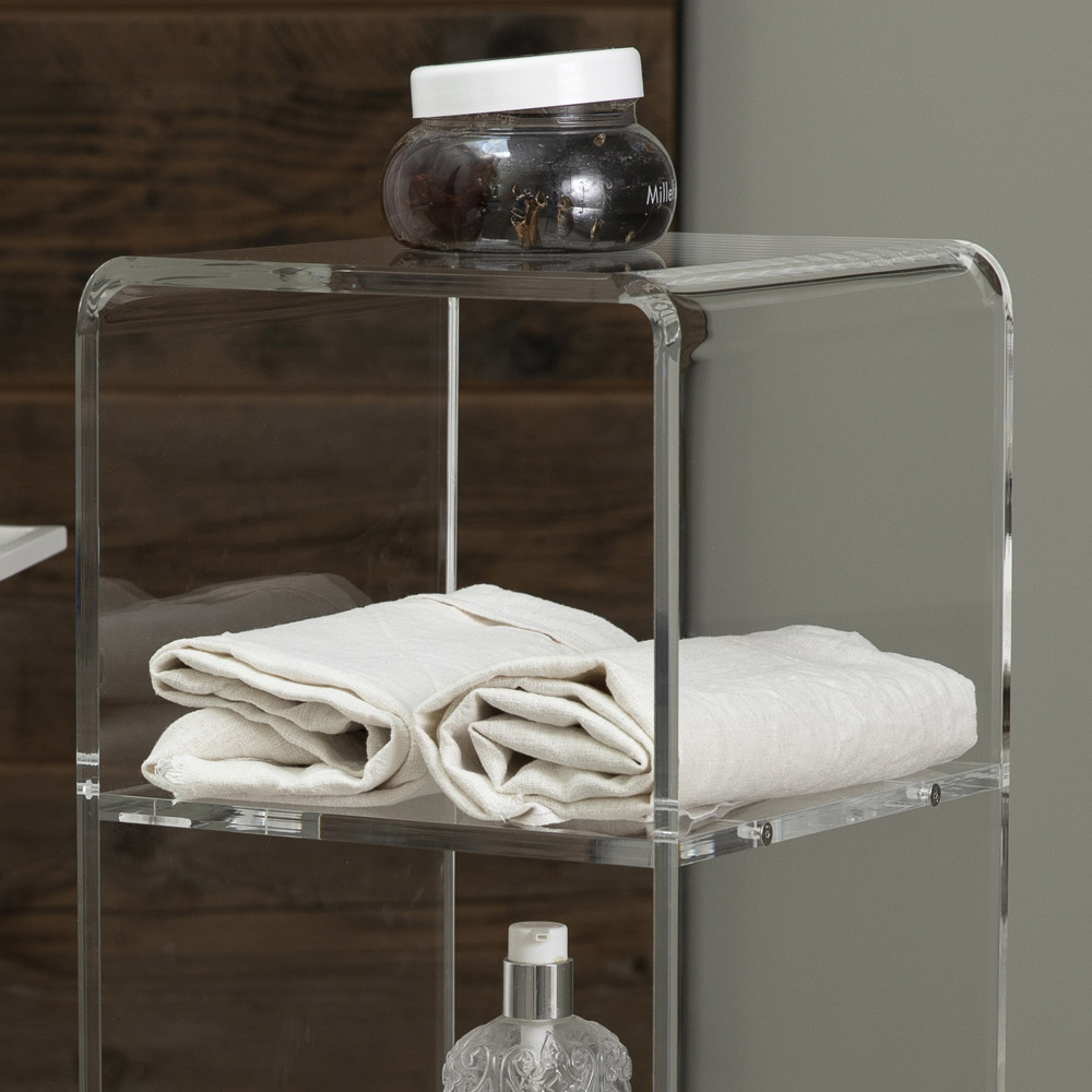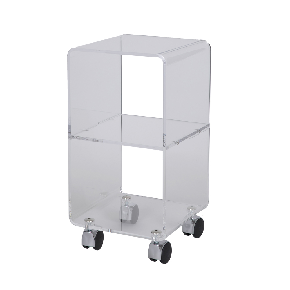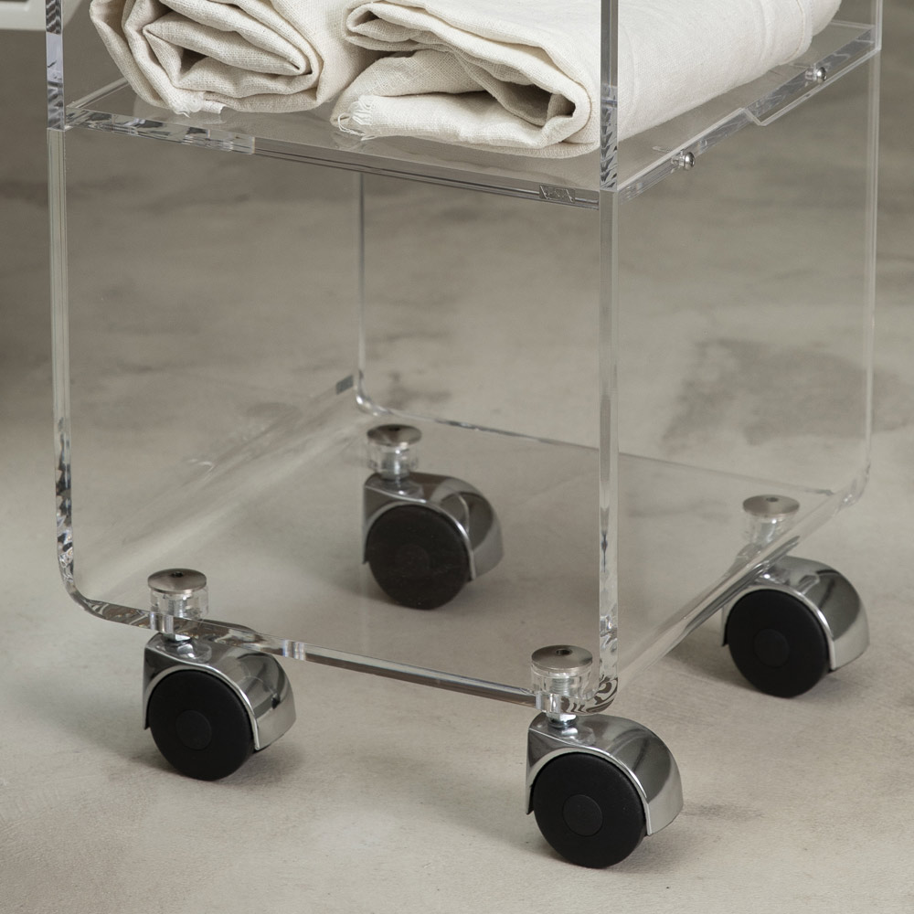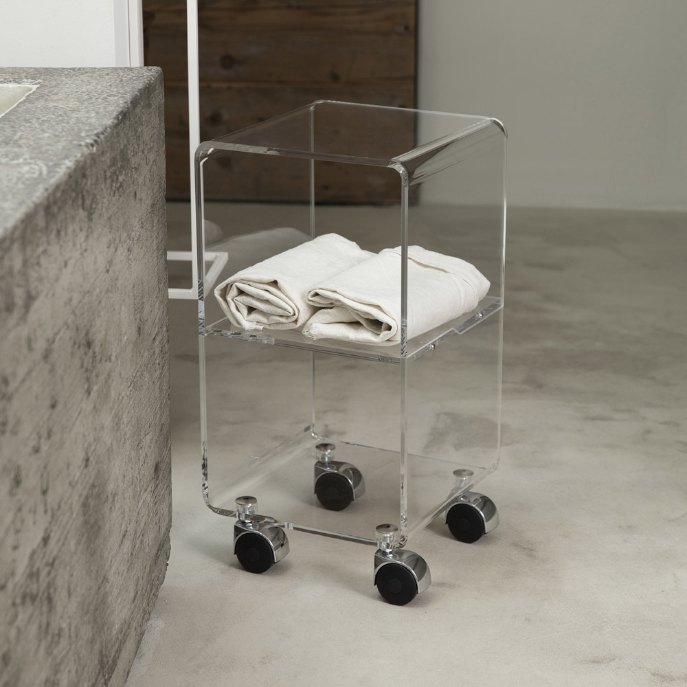 Column trolley in transparent acrylic crystal with wheels and 1 or 3 shelves, made in Italy.