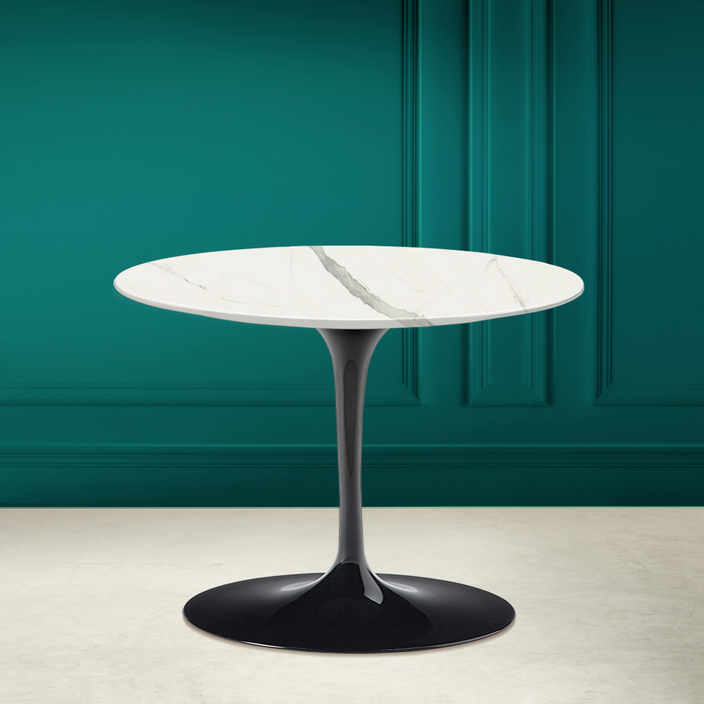 Round coffee table with full vein statuary ceramic top and polished aluminum base Made in Italy