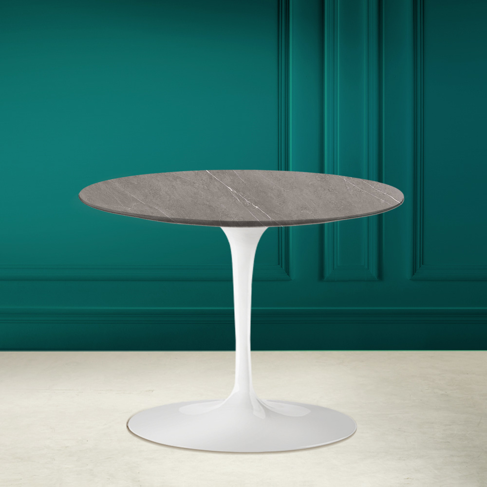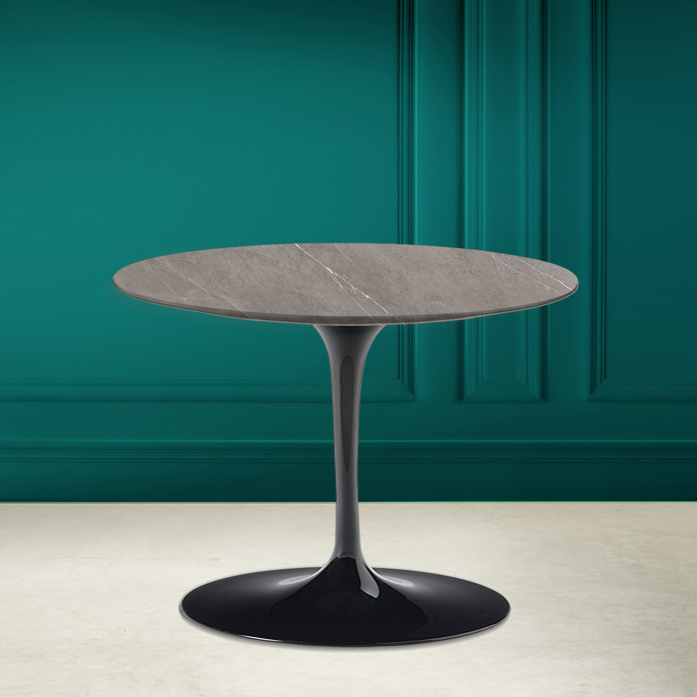 Coffee table with round top in gray stone ceramic, matt gray veined stone effect , and polished aluminum base entirely made in Italy . This furnishing accessory, thanks to its simple and refined finishes , can be inserted into any type of furniture in any living environment. Its main feature is the material of the top, i.e. stone gray ceramic which is an excellent ally for making the environment more welcoming and warm thanks to its highly prized and complex graphics . The union between ceramic and polished aluminum creates a perfect combination that makes this product suitable for all occasions and situations.