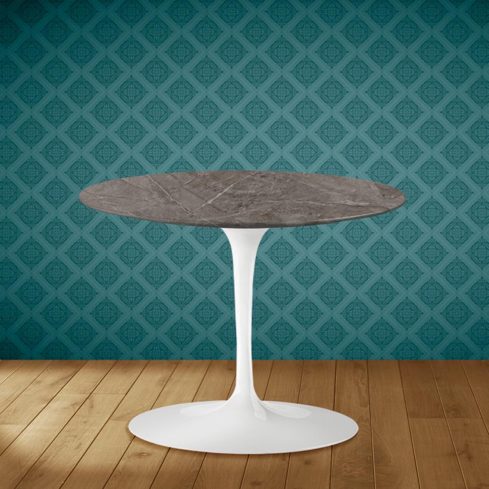 Coffee table with round top in kira ceramic, matt gris pilpis marble effect , and polished aluminum base entirely made in Italy . This furnishing accessory, thanks to its simple and refined finishes , can be placed in living environments furnished in different styles. The main feature that distinguishes it from similar products is the material of the top, kira ceramic, an excellent ally for making the environment more welcoming and pleasant thanks to its highly prized graphics . Furthermore, the union between ceramic and polished aluminum creates a perfect combination that makes this coffee table suitable for all occasions of use.