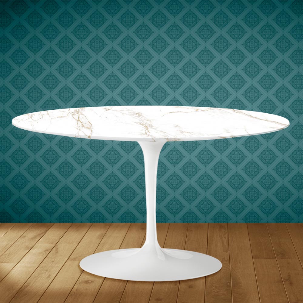 Coffee table with oval entzo ceramic top, matt calacatta gold marble effect , and polished aluminum base entirely made in Italy . This furnishing accessory has two unique characteristics: the entzo ceramic and the oval shape. Ceramic is characterized by its complex and very fine graphics which manages to create a warm and welcoming atmosphere in any living environment in which it is placed. This material is also of high quality and has considerable resistance . The particular oval shape is increasingly fashionable for furnishing rooms with originality thanks to the line and its practicality and functionality.