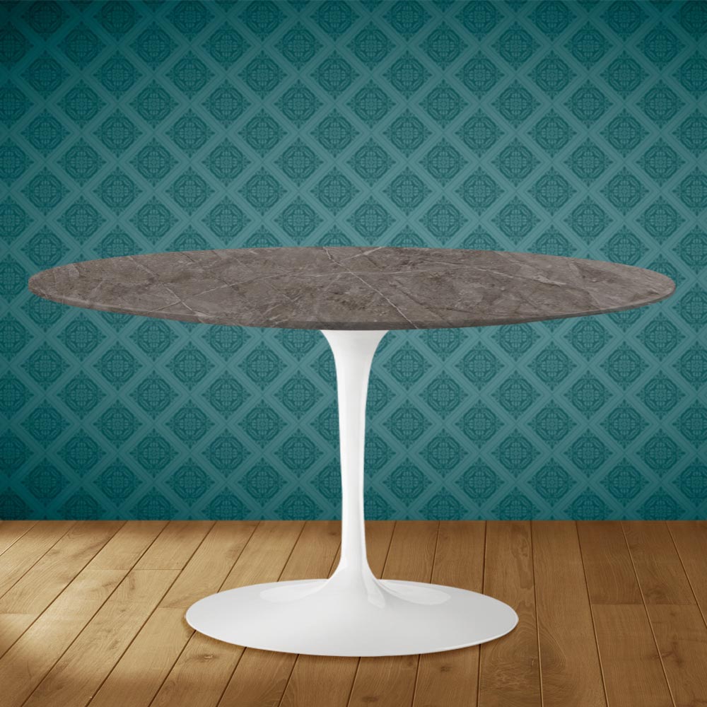 Coffee table with oval top in kira ceramic, matt gris pilpis marble effect , and polished aluminum base entirely made in Italy . This furnishing accessory has two unique characteristics: the kira ceramic and the oval shape. Ceramic is characterized by its complex and very fine graphics which manages to create a warm and welcoming atmosphere in any living environment in which it is placed. This material is also of high quality and has considerable resistance . The particular oval shape is increasingly fashionable for furnishing rooms with originality thanks to the line and its practicality and functionality.