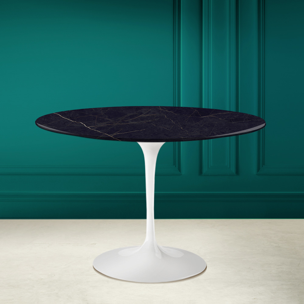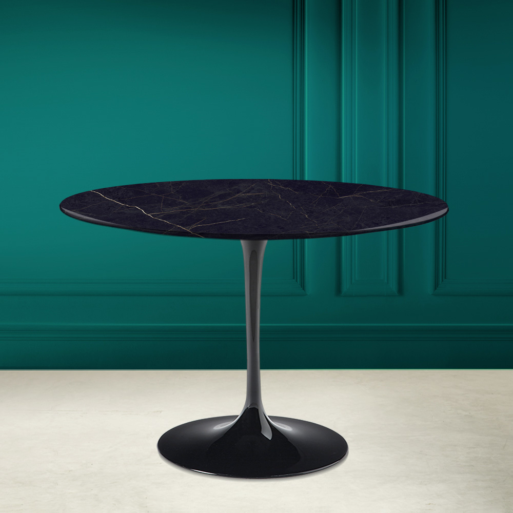 Round dining table with noir laurent ceramic top, matt noir laurent marble effect , and polished aluminum base entirely Made in Italy. This table combines functionality and elegance thanks to the materials used for its construction. The noir laurent ceramic has modern and lively veining that gives the table an original and refined touch and the polished aluminum of the base provides stability and quality . This unique product is perfect for being inserted in any living room and kitchen with any style of furniture from modern to contemporary to chic thanks to its simple and sophisticated finishes.