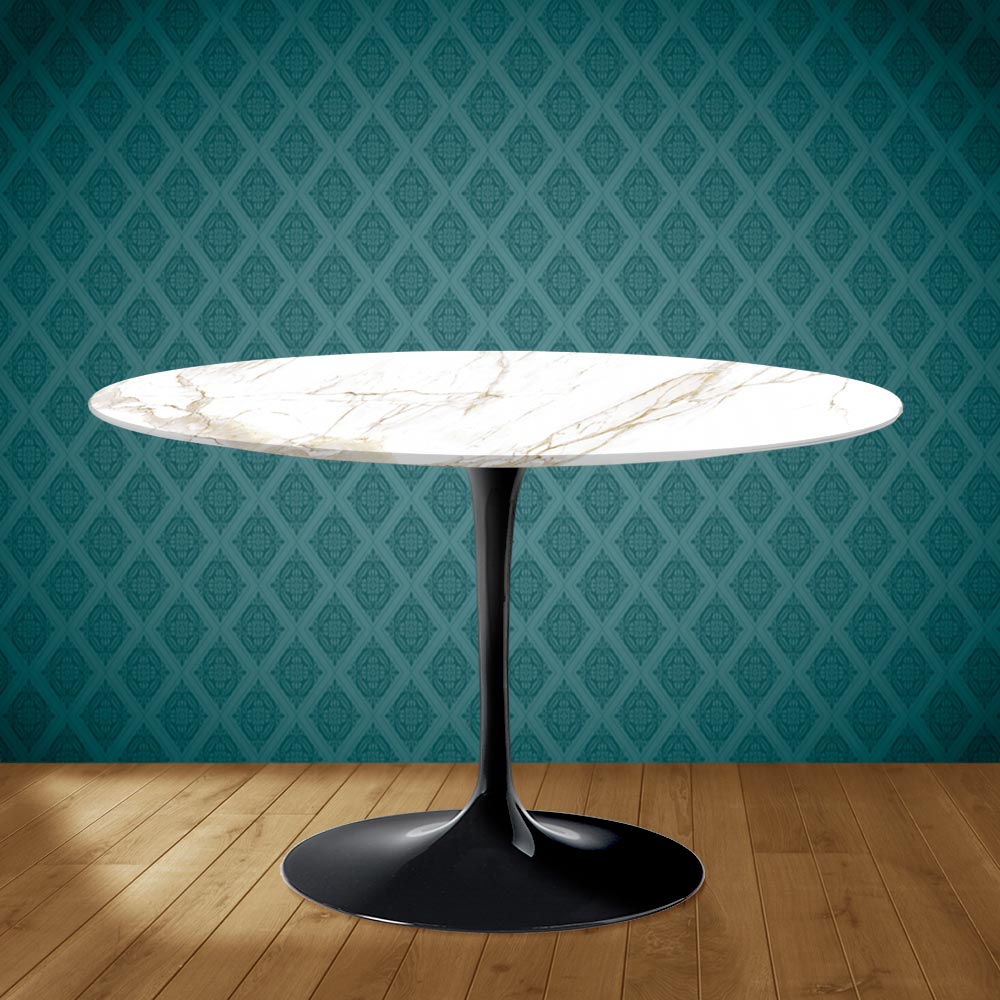 Dining table with round top in entzo ceramic, matt calacatta gold marble effect , and base in polished aluminum entirely Made in Italy. The linear and refined finishes create an element easy to insert in living environments and kitchens furnished with different styles. The union between the entzo ceramic and the polished aluminum makes this table suitable for all occasions of use, creating a welcoming room. The key words to describe this product are practicality and functionality without forgetting the elegance given by the particular coloring and graphics of the entzo ceramic.
