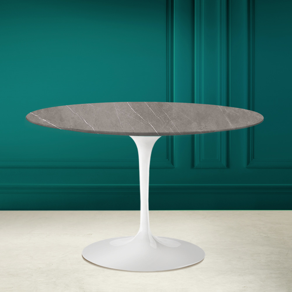 Dining table with round top in grey stone ceramic, matt veined grey stone effect , and base in polished aluminium entirely Made in Italy. The linear and refined finishes create an element that is easy to fit into any style of furniture in any living room and kitchen. The union between grey stone ceramic and polished aluminium makes this table suitable for all situations and occasions of use, creating a unique and welcoming room. The key words to describe this product are practicality and functionality without forgetting the elegance given by the particular colour and graphics of the grey stone ceramic.