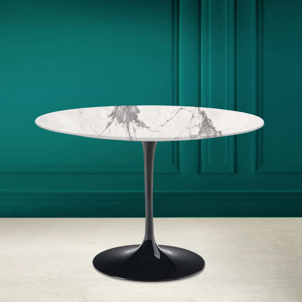 Round dining table with invisible select ceramic top, matt statuarietto marble effect , and polished aluminum base entirely Made in Italy. This table combines functionality and elegance thanks to the materials used for its construction. The invisible select ceramic has modern and lively veining that gives the table an original and refined touch and the polished aluminum of the base provides stability and quality . This unique product is perfect for being inserted in any living room and kitchen with any style of furniture from modern to contemporary to chic thanks to its simple and sophisticated finishes.