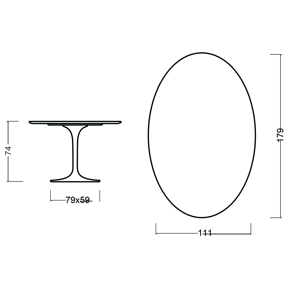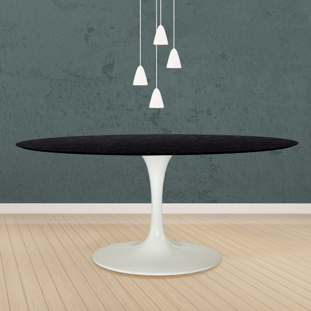 Dining table with oval top in black stained oak and polished aluminum base entirely made in Italy . The unprecedented union between the oval shape and the black stained oak top gives this table a touch of uniqueness and unmistakable elegance . It is perfect for completing the decor of any living room and kitchen thanks to its simple and refined finishes that give the room a warm and welcoming atmosphere. The materials used for the production guarantee quality and resistance even with the passage of time and make this product suitable for any situation and occasion of use.