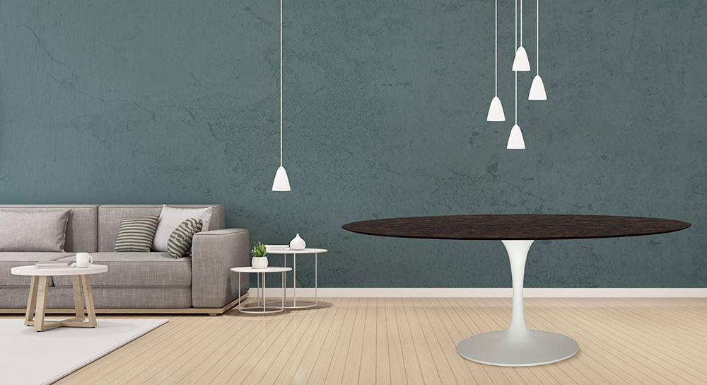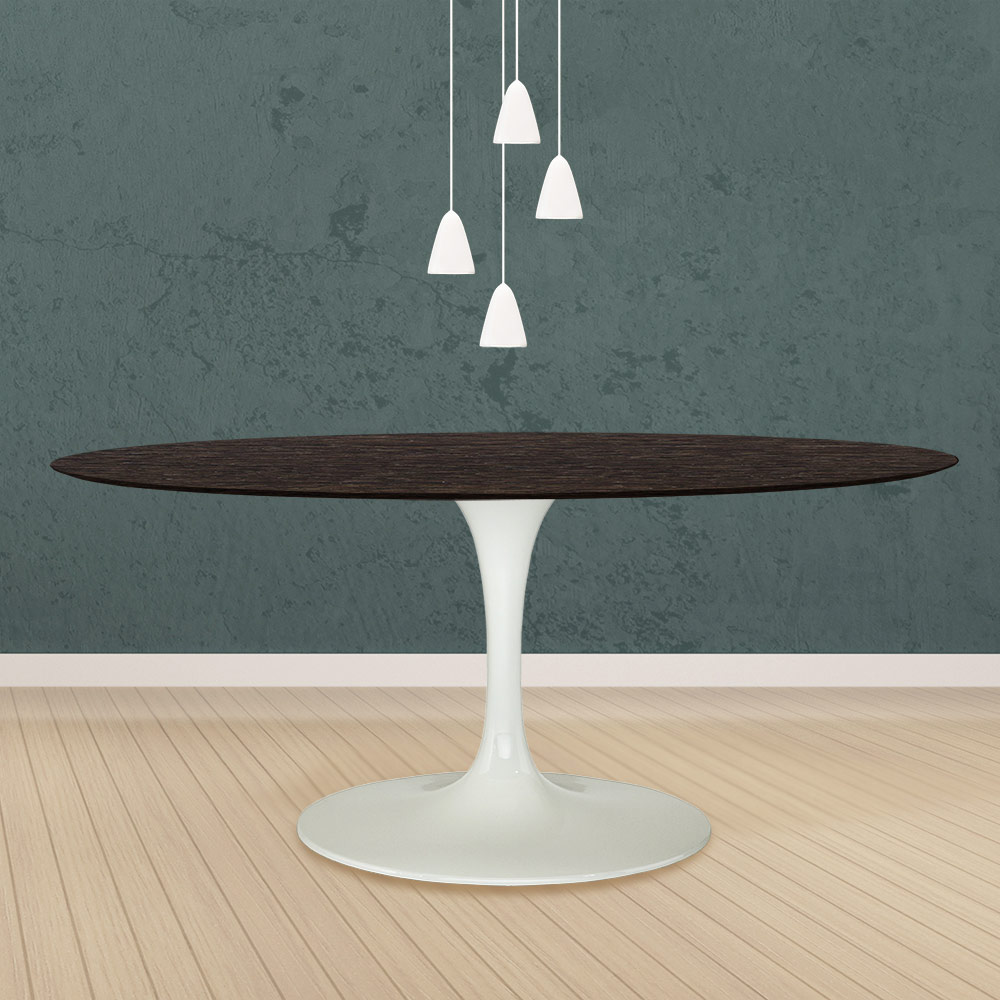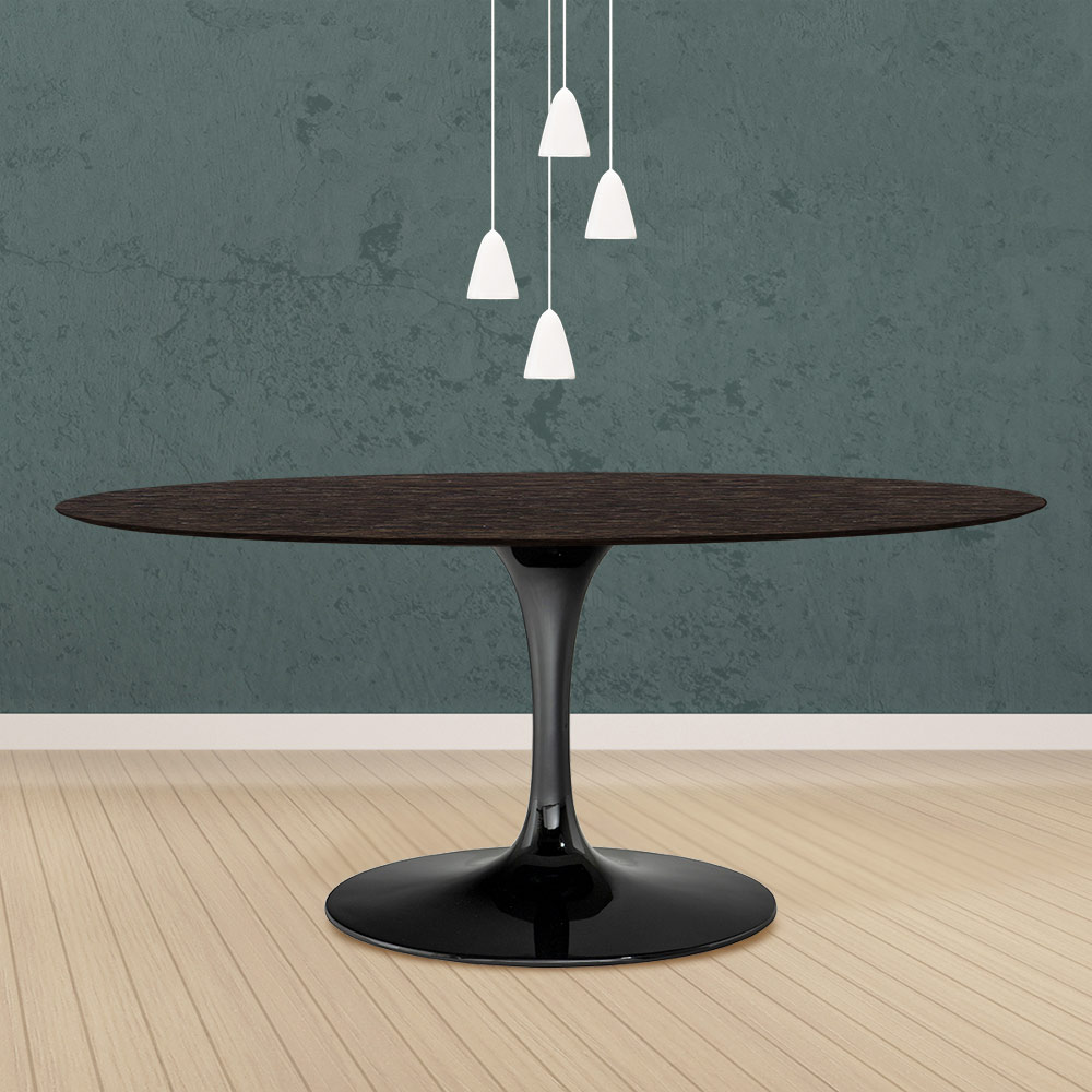 Dining table with oval top in mocha stained oak and polished aluminum base entirely made in Italy . The unprecedented union between the oval shape and the mocha stained oak top gives this table a touch of uniqueness and unmistakable elegance . It is perfect for completing the decor of any living room and kitchen thanks to its simple and refined finishes that give the room a warm and welcoming atmosphere. The materials used for the production guarantee quality and resistance even with the passage of time and make this product suitable for any situation and occasion of use.