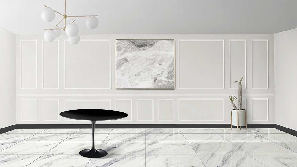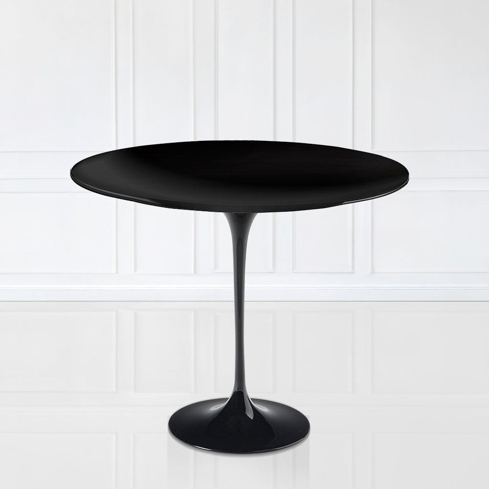 Dining table entirely made in Italy with round top in black liquid laminate and base in black polished aluminum . The seductive and refined design of this element allows you to furnish with taste and refinement any kind of living room and kitchen thanks to the round shape which gives a touch of originality to the room providing freshness and linearity to the style. It is essential to choose the dining table carefully as it is placed in the warmest and most welcoming place in the house and must create a perfect blend with the surrounding environment: the versatility of this table allows you to do it anywhere. This piece of furniture is ideal for completing any room with sobriety thanks to the simple and essential finishes. The liquid laminate top and polished aluminum base make this table suitable and functional for any occasion of use.