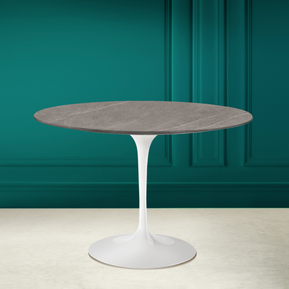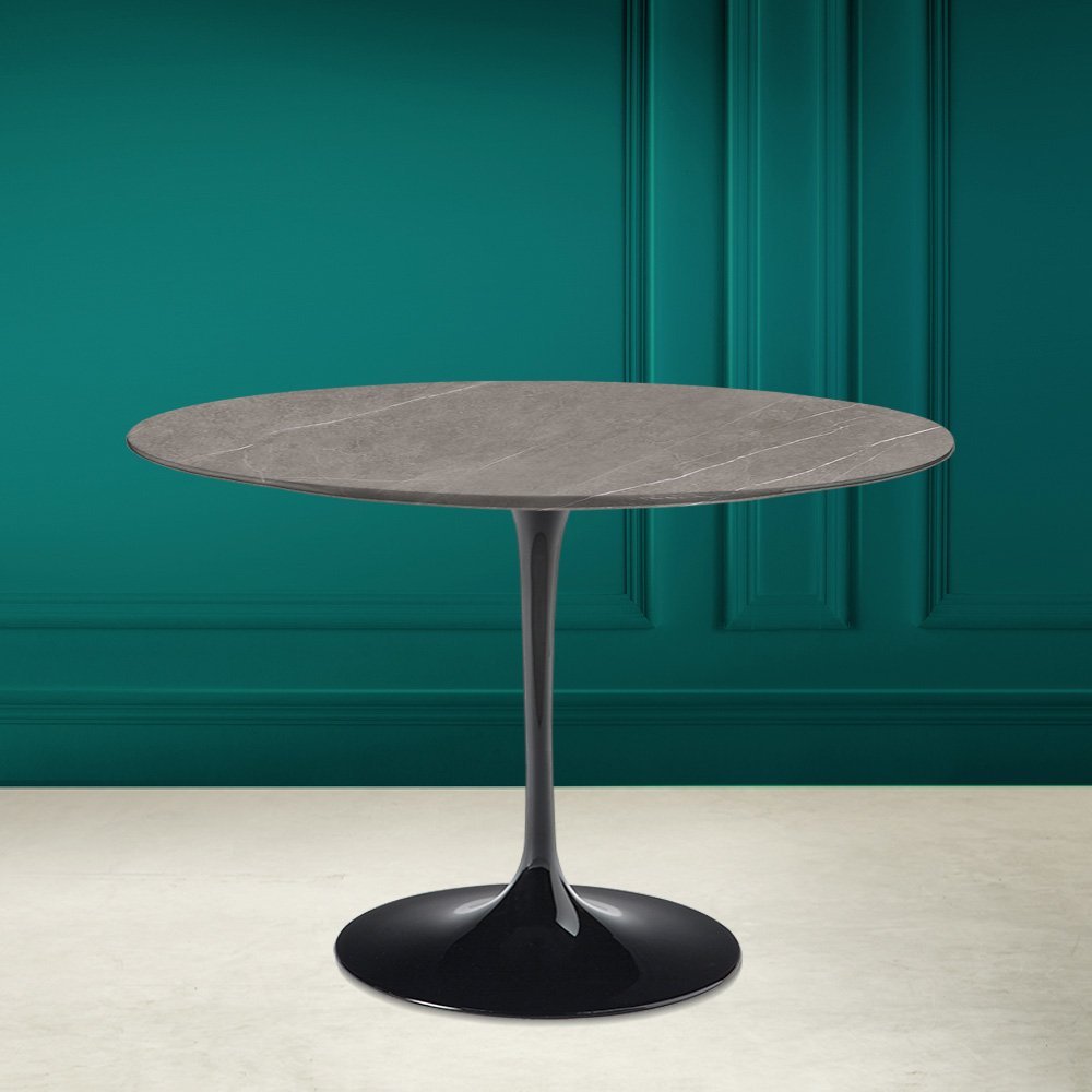 Dining table entirely Made in Italy with round top in grey stone ceramic, matt veined grey stone effect , and polished aluminum base. This table manages to combine functionality and practicality with elegance and refinement thanks to its simple finishes and the particular grey stone ceramic. The product has a linear and refined shape that makes it suitable to complete the decor of any living room and kitchen giving a unique touch. The grey stone ceramic has a very complex and sophisticated color and graphics that make the room welcoming and unforgettable. This table is the perfect idea to furnish with taste and, at the same time, ease of use any place.