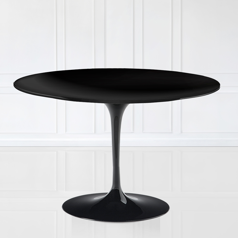 Round dining table with black liquid laminate top and black polished aluminum base Made in Italy
