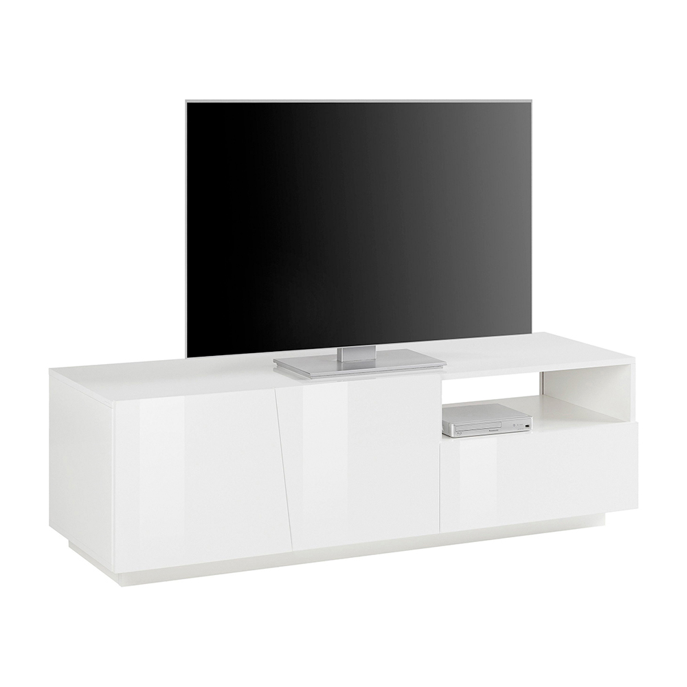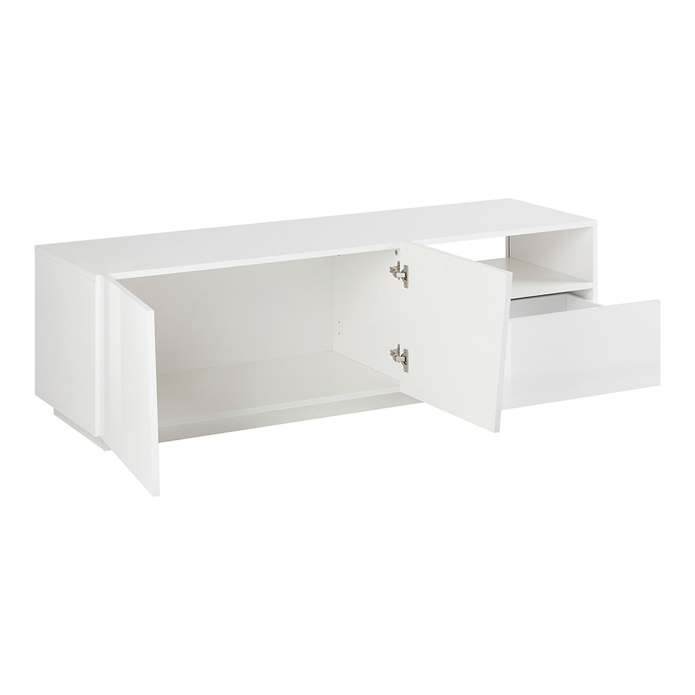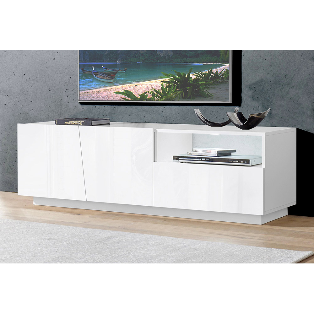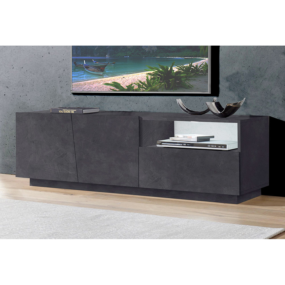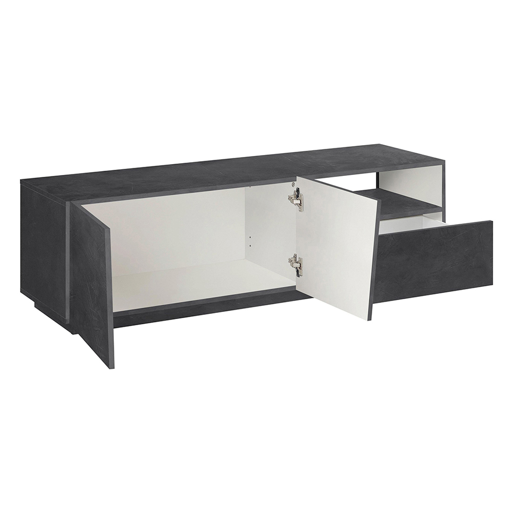 The TV stand is made up of 2 hinged doors, a drawer and an open compartment which guarantee plenty of storage space. It is made of melamine and is 100% Made in Italy . This product lends itself to completing the decor of any living area thanks to its simple and elegant finishes that give the room a unique and unforgettable touch. The material used guarantees quality and resistance even over time.
