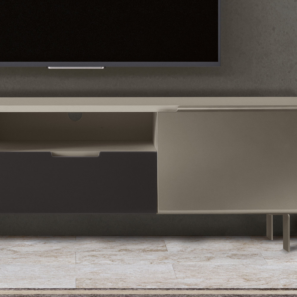 The TV stand is a very important furnishing accessory in every home and has multiple roles: from supporting the television to having an aesthetic and decorative function. Modern and elegant product in MDF composed of 2nickel-finished doors that open with cushioned hinges , a mink-finishedbody and nickel-colouredironfeet , a charcoal-finished drawer and an open compartment that guarantee extra storage space. It is a furnishing accessory with a minimal design that combines an elegant aesthetic with a wide utility and fits perfectly into any living room creating a perfect harmony with the surrounding elements.