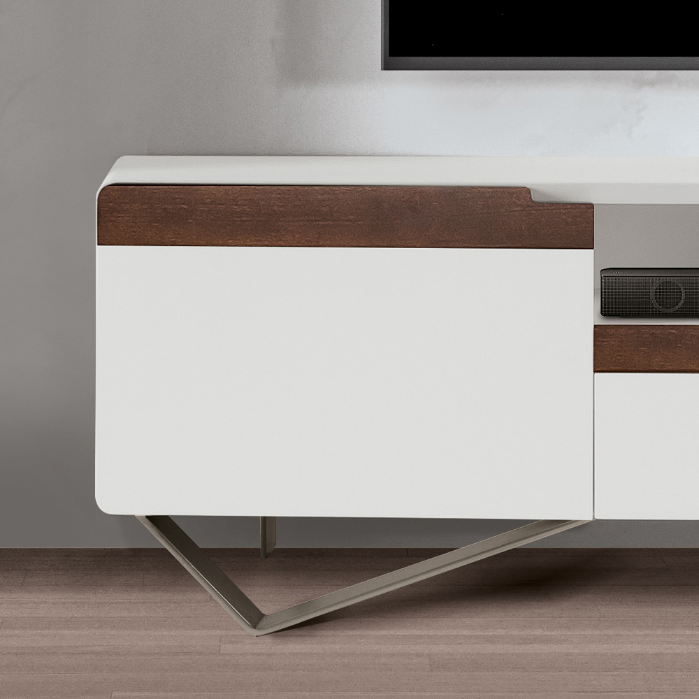 The TV stand is a very important furnishing accessory in every home and has multiple roles: from supporting the television to having an aesthetic and decorative function. Modern and elegant product in white MDF with nickel- coloured iron feet composed of 2 doors in white finish with solid tulipwood edge in canaletto finish, a drawer in the same finish and an open compartment that provides extra storage space.
