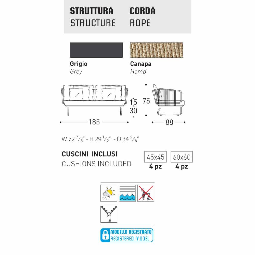 Thanks to its versatile design, the sofa Babylon can be used both outdoor (garden, patio, poolside) or indoor. It comes with 8 pillows: n°4 pillows 45x45 cm and n°4 pillow 60x60 cm. Removable covering. With the Babylon collection you can create your own customized garden furniture compisition. Ask us for a quotation.