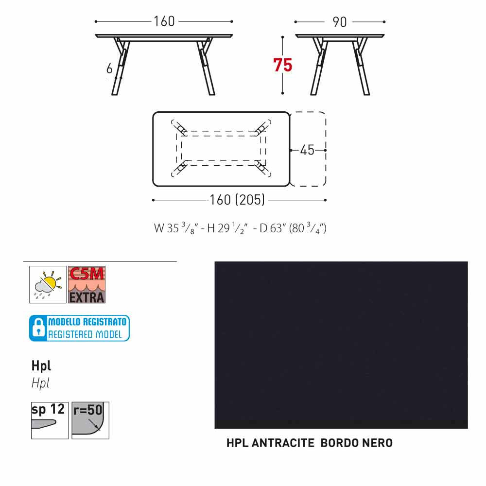 HPL technical features : High-pressure laminates. They are made of several layers of paper (70%) impregnated with thermosetting resins (30%) and compacted for about 45-50 minutes through the combined action of heat ( at about 150 degrees) and high pressure (greater than 7 MPa / Megapascal per square meter.) The result is a stable, nonreactive, non-porous and high-density product. It has physical and chemical features of high mechanical strength (controlled temperature excursion +80/-40 degrees, for less than 30 seconds at extreme temperatures). It resists to light exposure and temperature variations, even in marine environments.