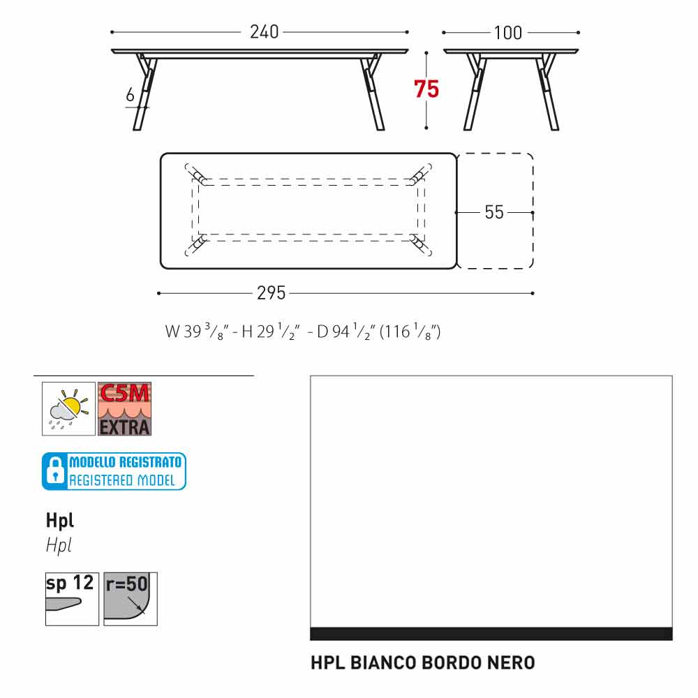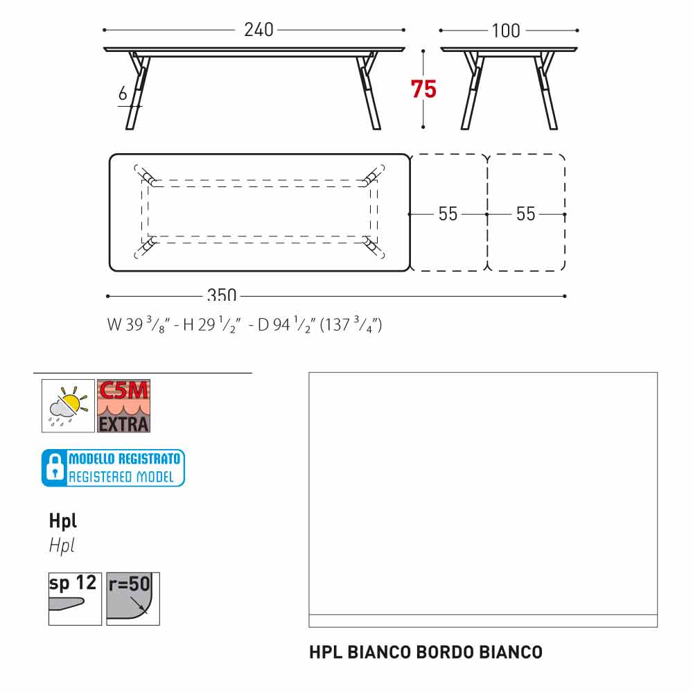 100x240/350x75cm - 2 extension leaves 55 cm ciascuna