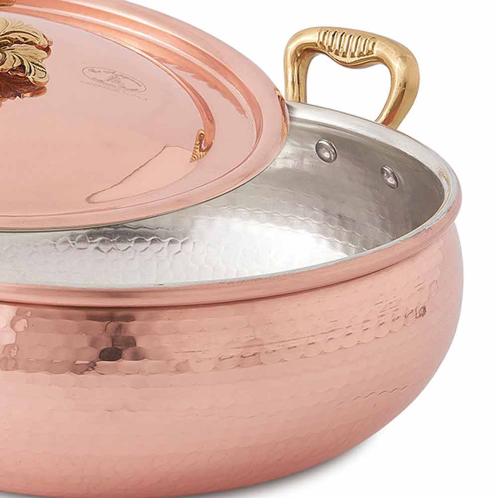 Rounded vegetable dish in hammered copper with handles and lid, made in Italy craftsmanship.