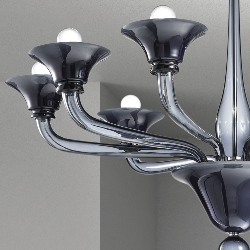 Chandelier handcrafted in Italy in Venice glass with milk white-gray finish with metal details in polished chrome finish . An unprecedented encounter between historical lines and contemporary design to give life to a piece of furniture with timeless charm and elegance. Its aesthetic is characterized by an articulated volume that becomes dynamic and light through the luminous vibration of the marvelous blown glass surfaces that alternate the elegant transparent arms with the cups made through the use of the casing technique . To underline its value is the attention to detail that transpires from the chromed metal components which allow the product to adapt to different tastes and situations of use.