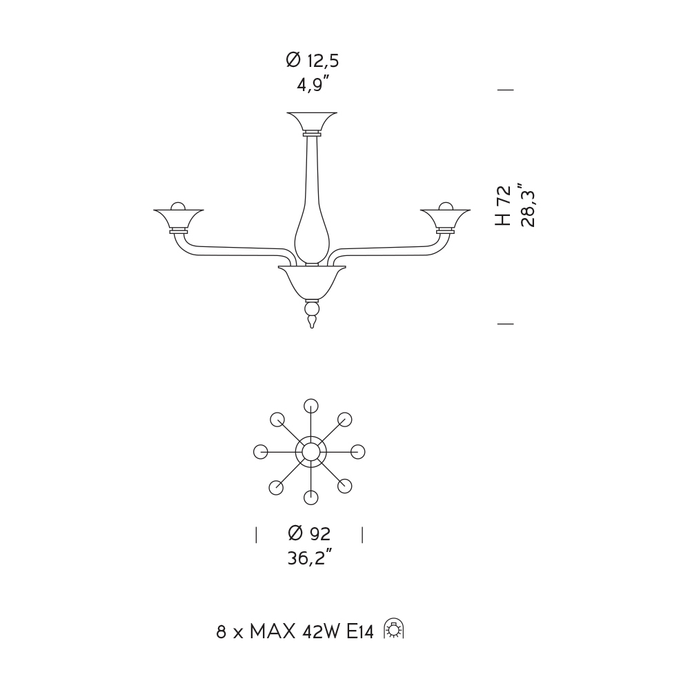 8 lights chandelier in Venice glass and metal Made in Italy.