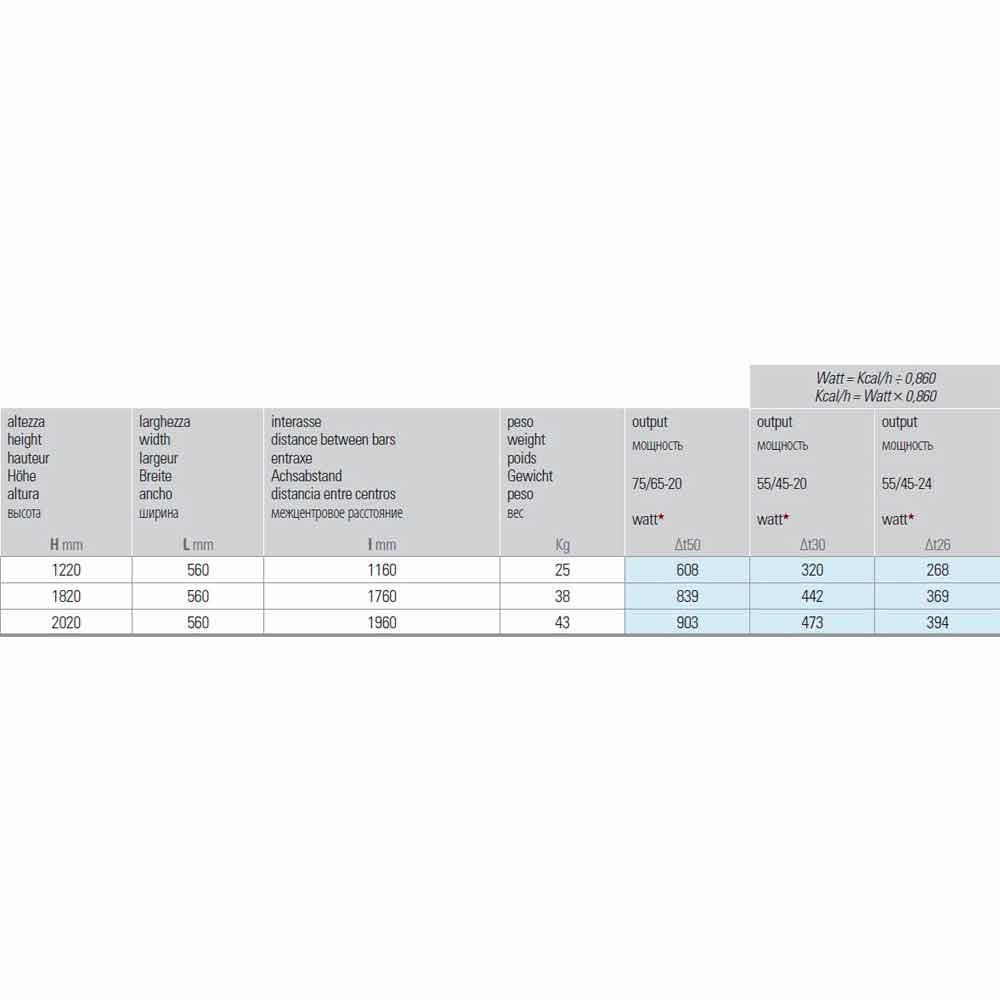 - H 1820 x L 560 x Inter. 1760 mm x Output w (Δt50 *) 839; Yield w (Δt30 *) 442; Yield w (Δt26 *) 369