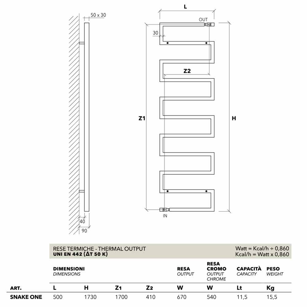 | Measures | L.500 mm, H.1730 mm, Wheelbase1 1700 mm, Wheelbase2 410 mm, Thermal output 670 Watt, Capacity 11.5 Lt, Weight 15.5 Kg |