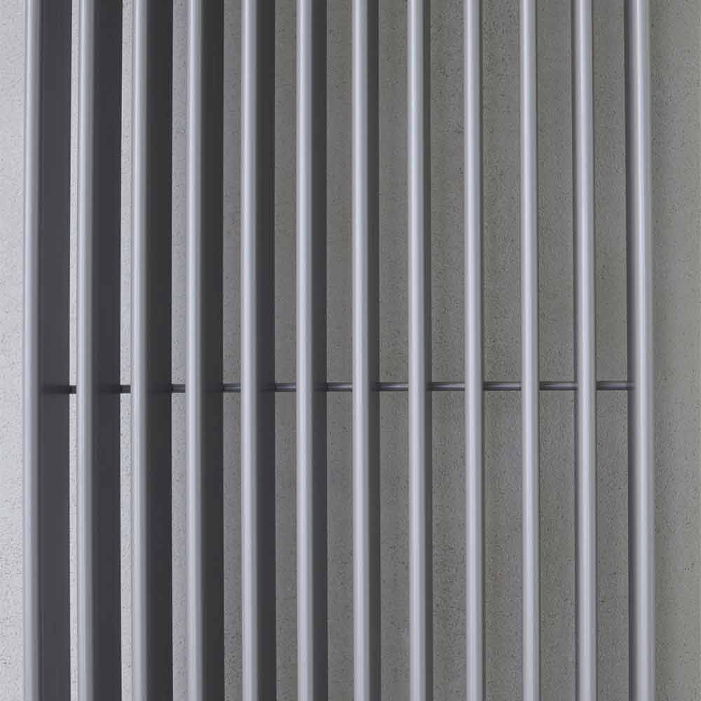 of 70 x 11 mm vertical flat tubes welded perpendicularly to the 35 mm diameter manifolds, for a minimal and modern design.