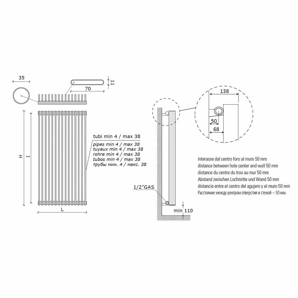 Vertical tubular steel radiator, modern wall design and made in Italy.