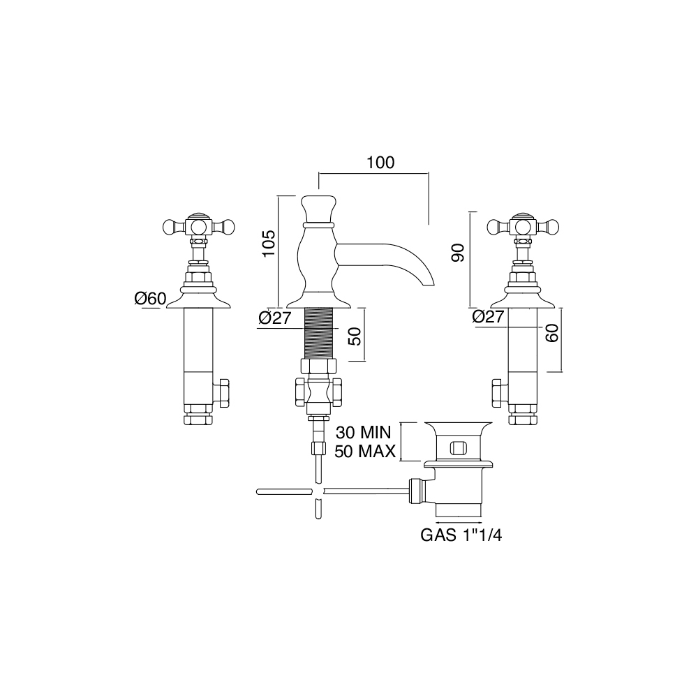 3-hole washbasin faucet for vintage design brass washbasin Elisea, made in Italy.