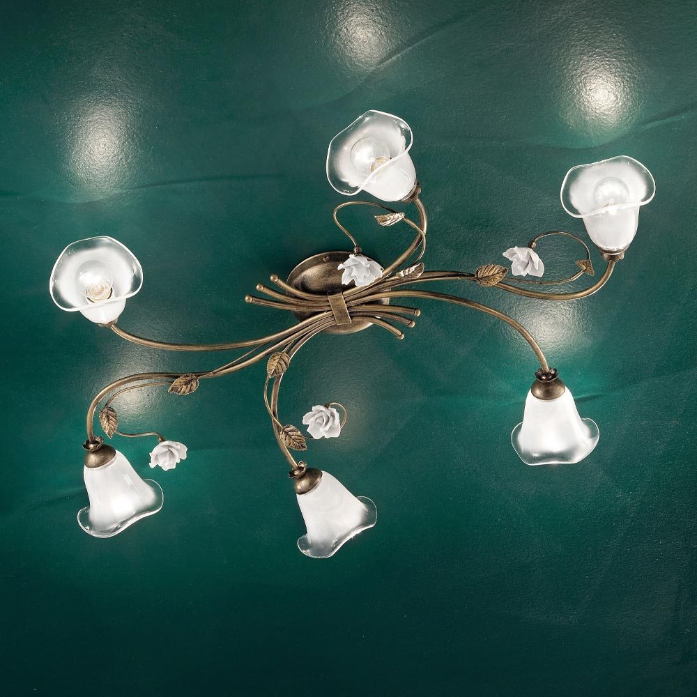 This 6-light ceiling lamp is entirely made with a metal structure reminiscent of leafy branches and shaded sandblasted glass lampshades with handcrafted decorations in the shape of ceramic roses, to highlight the craftsmanship and manual skills of the artisans. The design is characterized by lightness and delicacy transmitted through a composition designed to illuminate environments with a reference to the luxuriant force of nature.