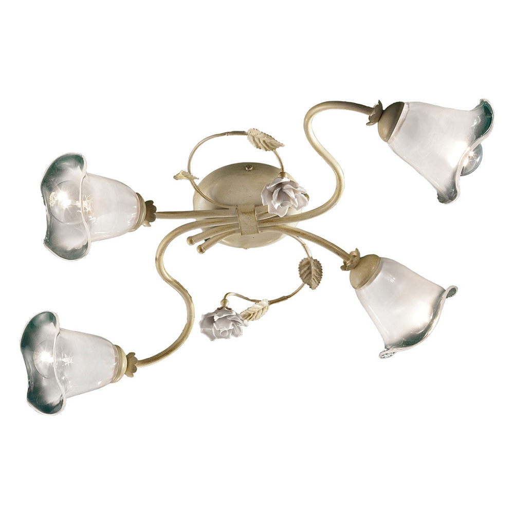 This ceiling lamp with 3 or 4 lights is entirely made with a metal structure reminiscent of leafy branches and shaded sandblasted glass lampshades with handcrafted decorations in the shape of ceramic roses, to highlight the craftsmanship and manual skills of the artisans. The design is characterized by lightness and delicacy transmitted through a composition designed to illuminate environments with a reference to the luxuriant force of nature.