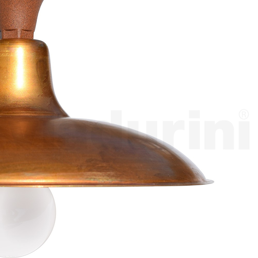 Outdoor ceiling light with die-cast aluminum structure and natural brass diffuser (d. 260mm)   entirely made in Italy . Complete with stainless steel screws and silicone gasket for greater protection. A furnishing idea that combines functionality and elegance thanks to its aesthetics marked by refined features and decorations with an ancient personality that underline its uniqueness and make it perfect for carefully furnishing any outdoor space. Ideal for environments such as gardens, courtyards, avenues and walkways but also contract spaces such as bars and restaurants.