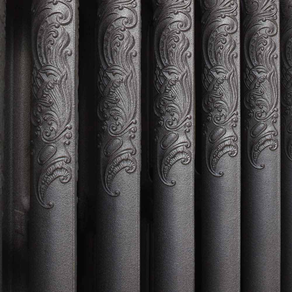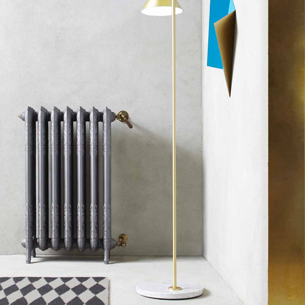 Hydraulic design floor radiator in baroque style in cast iron with 2 columns and 7 decorated elements.