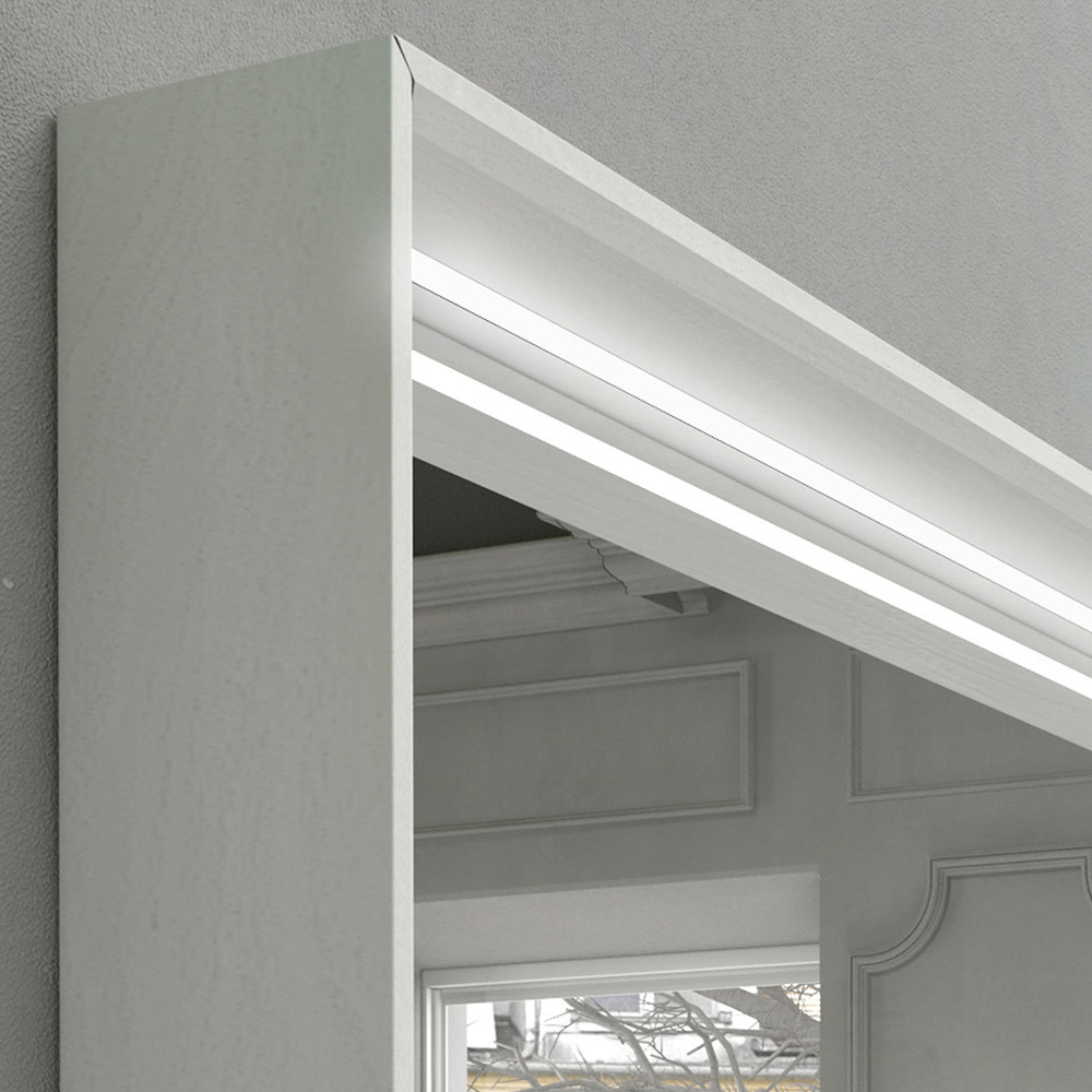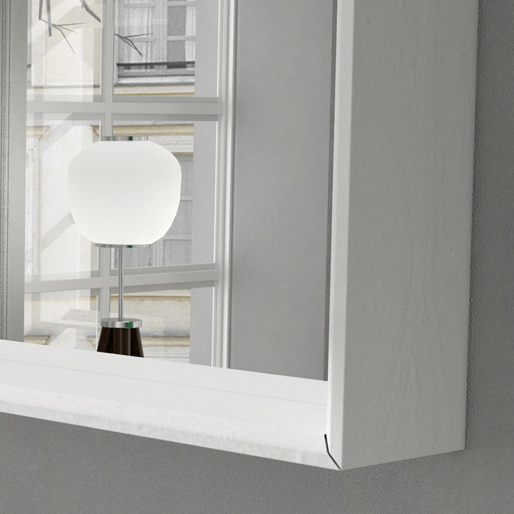 This rectangular design wall mirror available in two sizes is characterized by its elegant box-shaped frame in matt white lacquered wood which gives it a modern and original look. It features integrated LED top lighting for a functional and practical design.