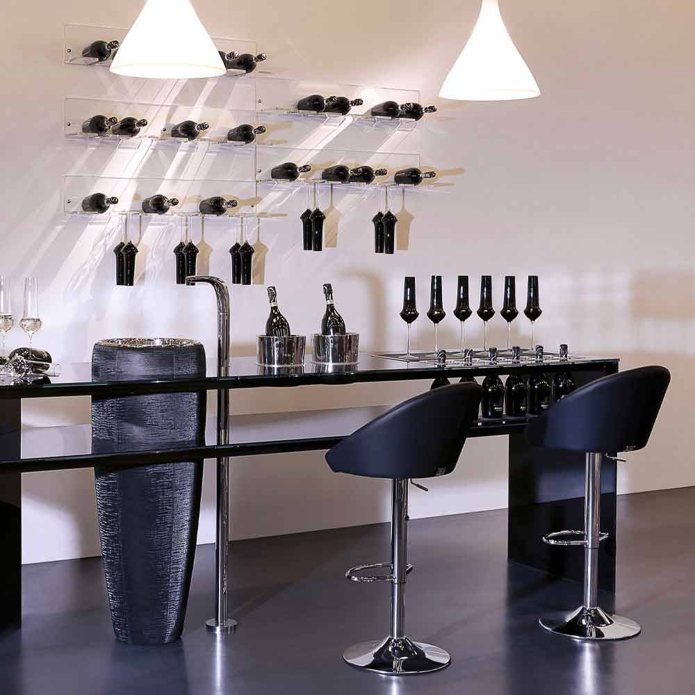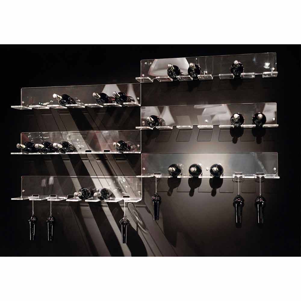 Wall-mounted bottle holder made entirely in Italy in transparent plexiglass that allows you to store and organize up to 6 bottles or 6 wine glasses. A furnishing solution that, in addition to offering a practical and functional idea for arranging your own bottles of wine in a structured way, also responds to the needs of those looking for a product that can optimize space thanks to a minimum footprint. . The material used and the chosen finish also make it an extremely versatile product capable of adapting to every stylistic situation, both domestic and contract, bringing with it a modern and innovative touch . The 100% Made in Italy workmanship and the use of quality raw materials give life to a solid and robust bottle holder , ideal for those who love to furnish their rooms with personality without neglecting the fundamental functional aspect of the product for an optimal result .