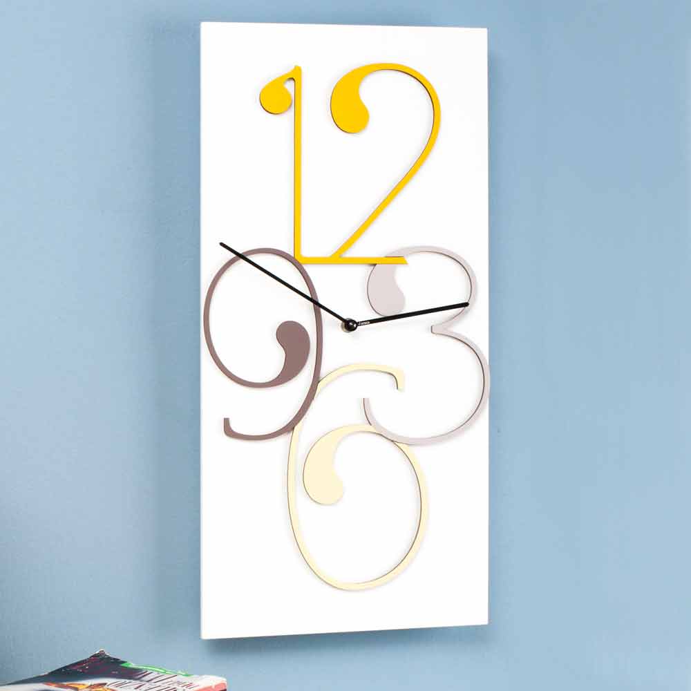 Wall clock in matt white wood with colored numbers, two versions of rectangular and modern design made in Italy.